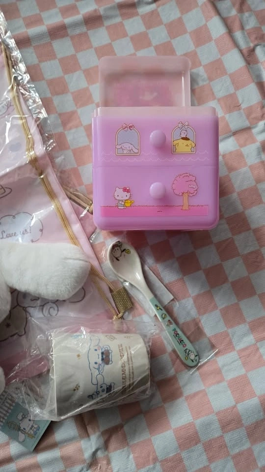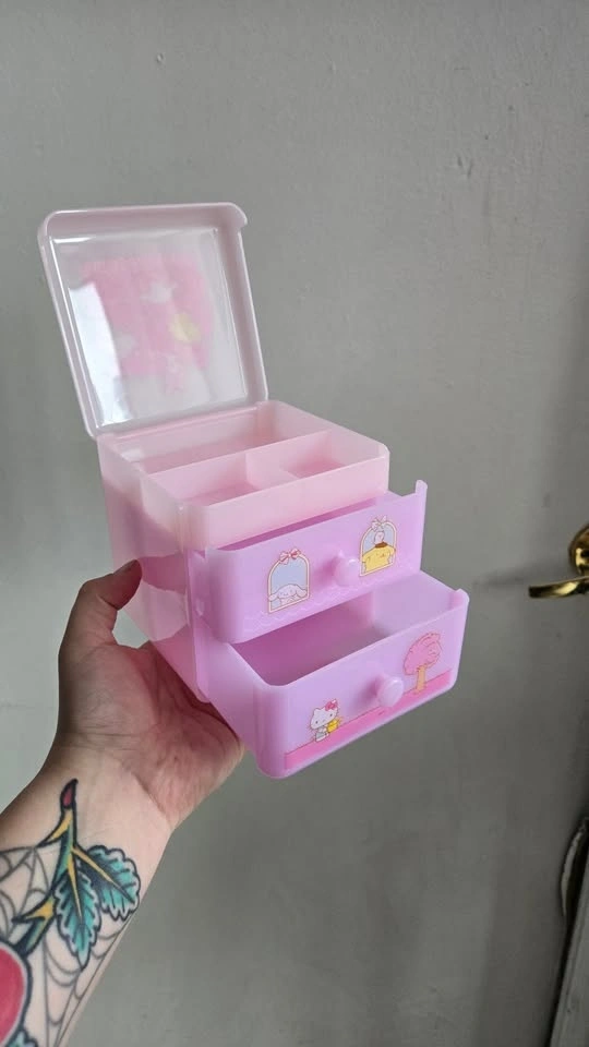- Pink Sanrio characters jewelry/trinket box with 2 drawers and lid (Hello Kitty, Pompompurrin, Cinnamoroll, My Melody). 4.5" x 4.5" x 4.5". $10