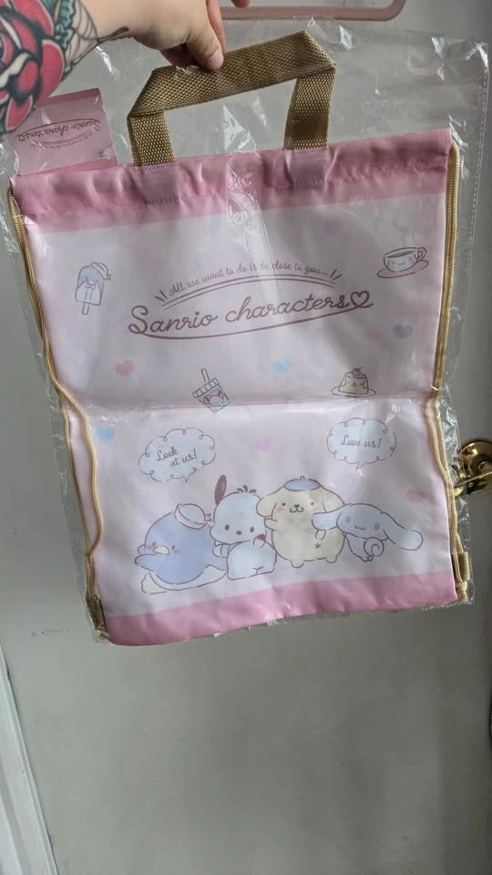 - 2x Sanrio characters pink tote/drawstring backpack with handle (Cinnamoroll, Pochacco, Pompompurrin, Tuxedo Sam). 16.5" x 13". $10