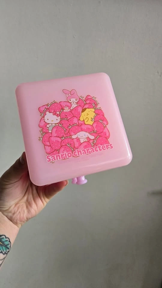 - Pink Sanrio characters jewelry/trinket box with 2 drawers and lid (Hello Kitty, Pompompurrin, Cinnamoroll, My Melody). 4.5" x 4.5" x 4.5". $10
