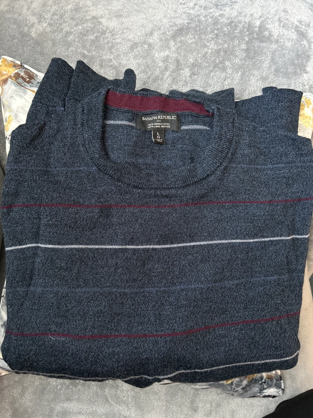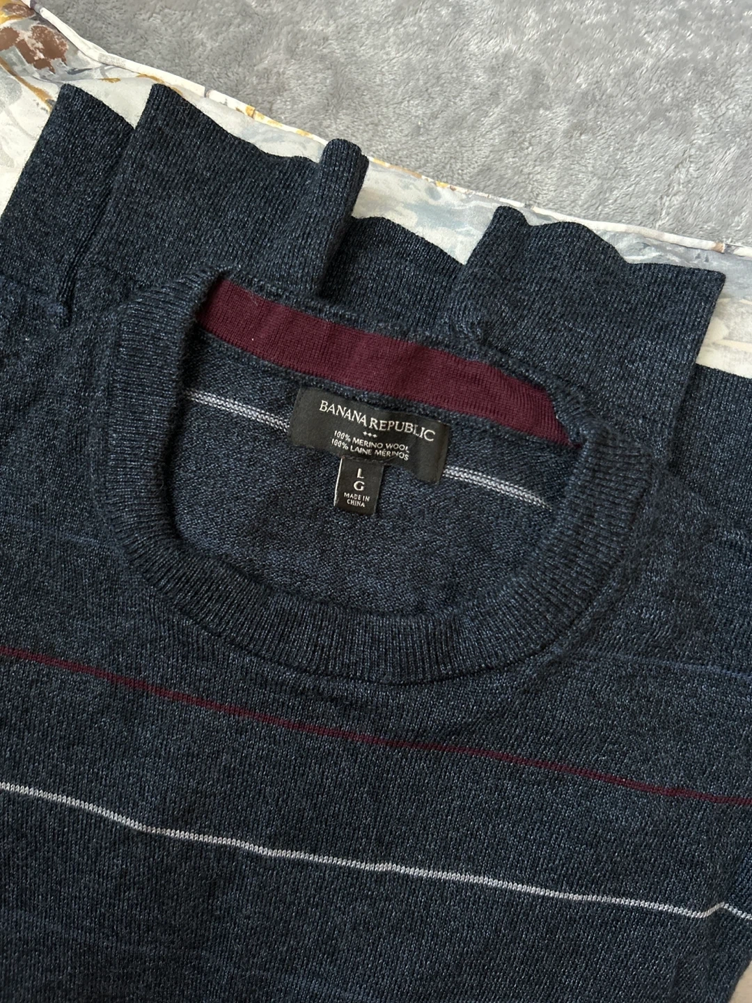 This Banana Republic crew neck sweater is made from a blend of merino wool and lamb's wool. It's a size large with subtle striping. Perfect for layering on cooler days! This is new, never worn just I cut the tag It fits for M also