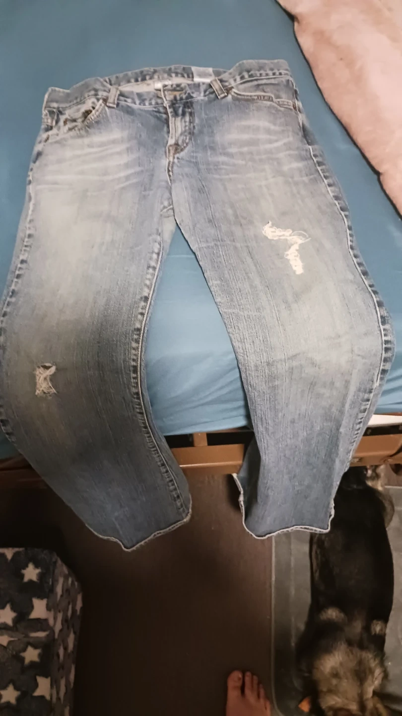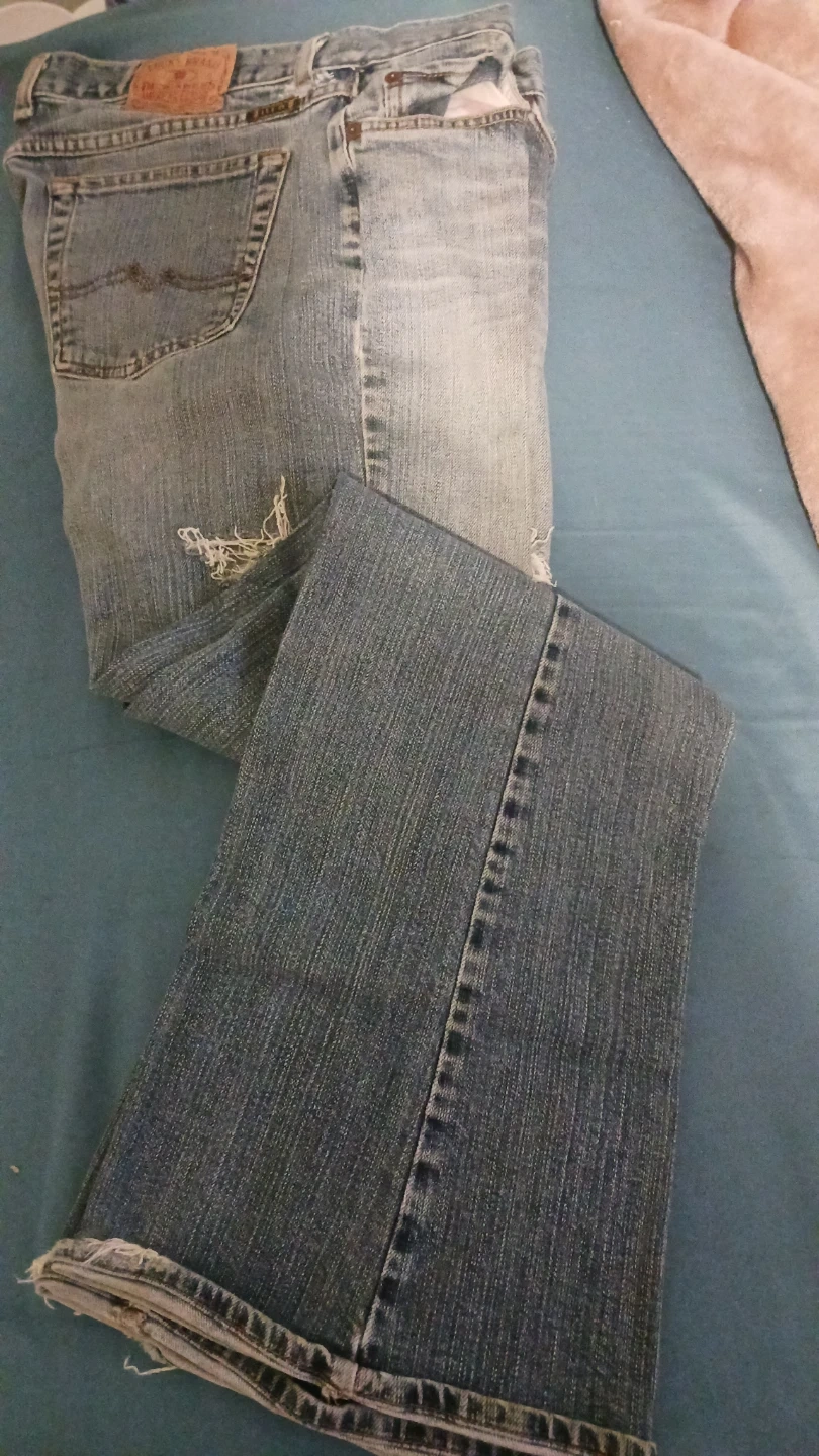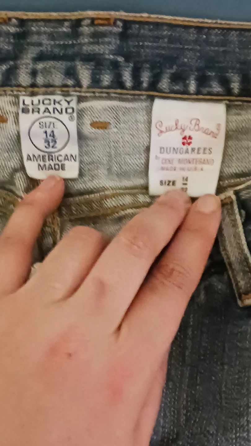 These are Lucky Brand women's jeans in a light wash denim. They are a size 14 with a 32-inch inseam. These jeans feature distressed details and are made in the USA. They have like a (boyfriend) cut!