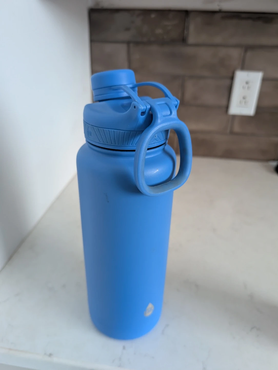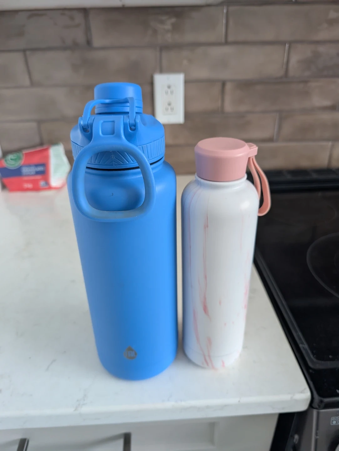 Two stainless steel water bottles are available. One is blue with a flip-top lid and carry handle. The other has a white and pink marble design with a screw-top lid and a loop. Both are good for staying hydrated on the go! Both will be cleaned again before selling