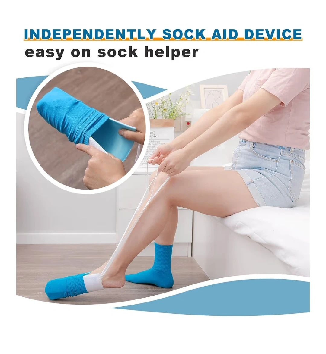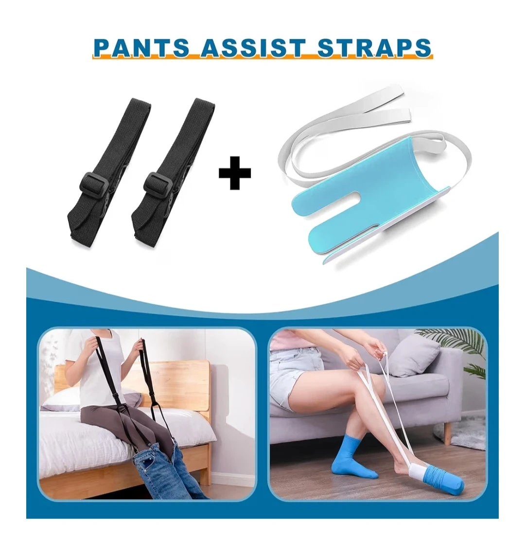 This sock aid device is designed to help you easily put on socks. It's helpful for those with limited mobility or recovering from injury. The package also includes pants assist straps for added convenience.