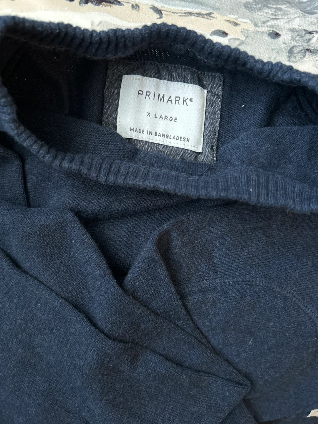This Primark sweater is a size X Large and navy blue. It's made from a soft material, perfect for cooler weather. It fits also L size. Very warm inside! Only serious request please!