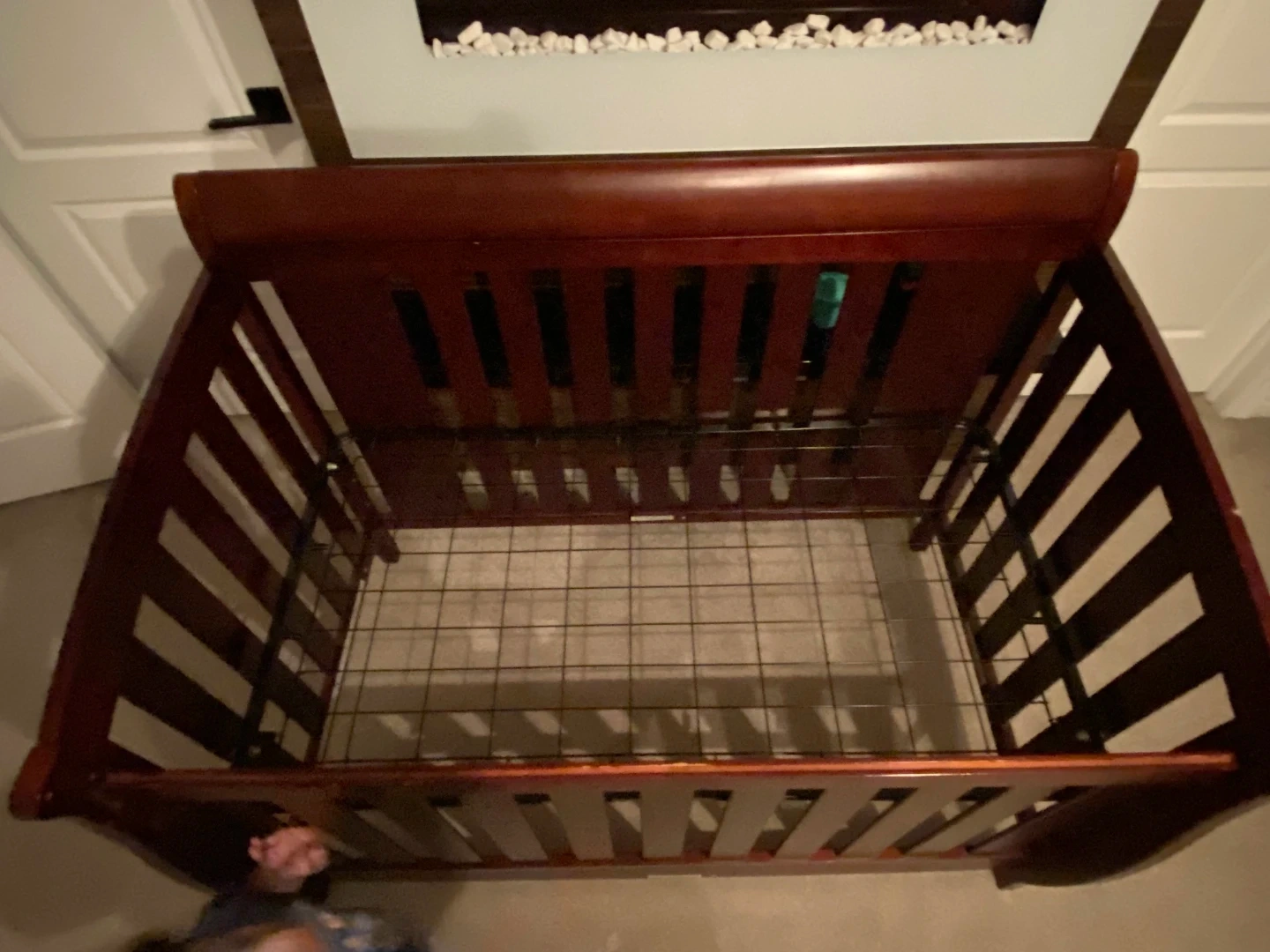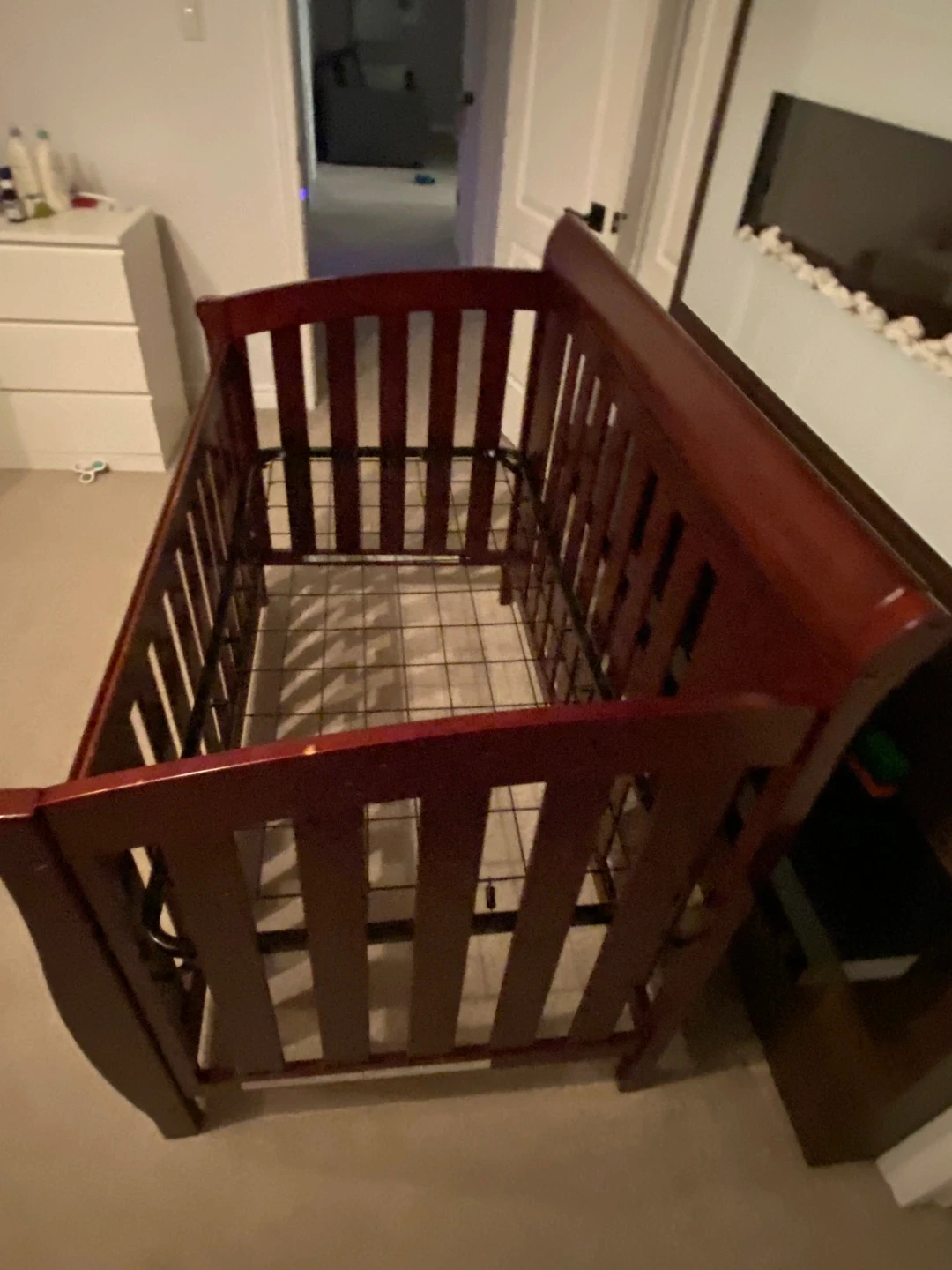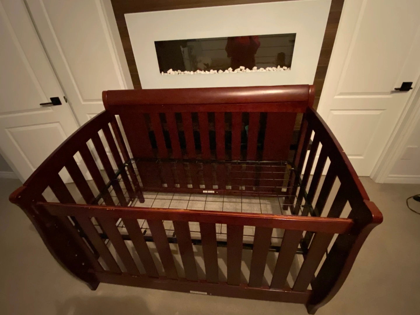 A sturdy wooden crib with a dark cherry finish. This crib features adjustable mattress height and a sleigh design. It's a classic addition to any nursery.
