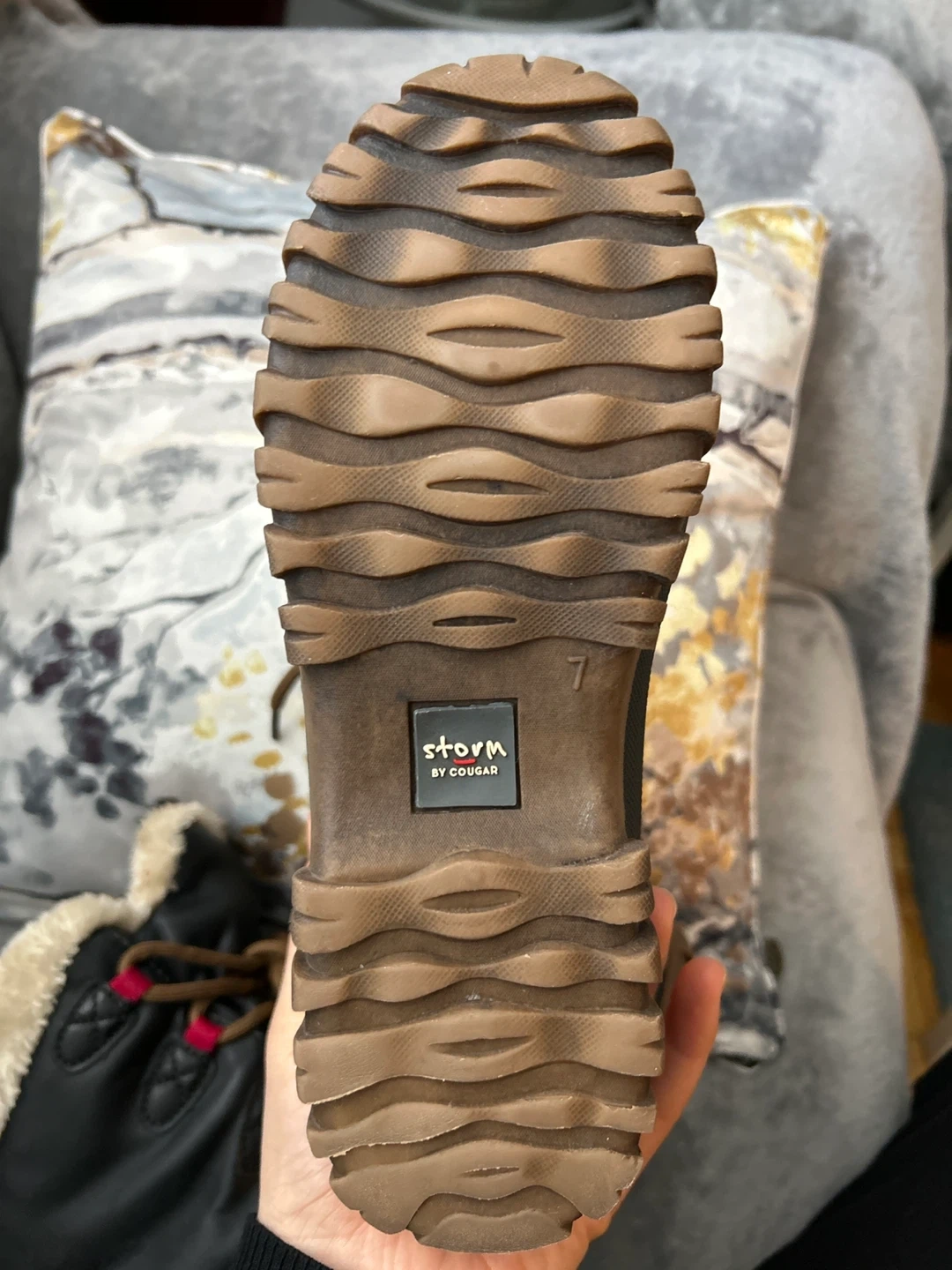 These Cougar Storm boots are black with a cozy faux fur lining. They're size 7 US, 37 EU, 4.5 UK, and 24 CM. I am 38 EU and it fits me. Perfect for keeping your feet warm and dry during the colder months! I have used them twice for mountain climbing. Only serious requests!