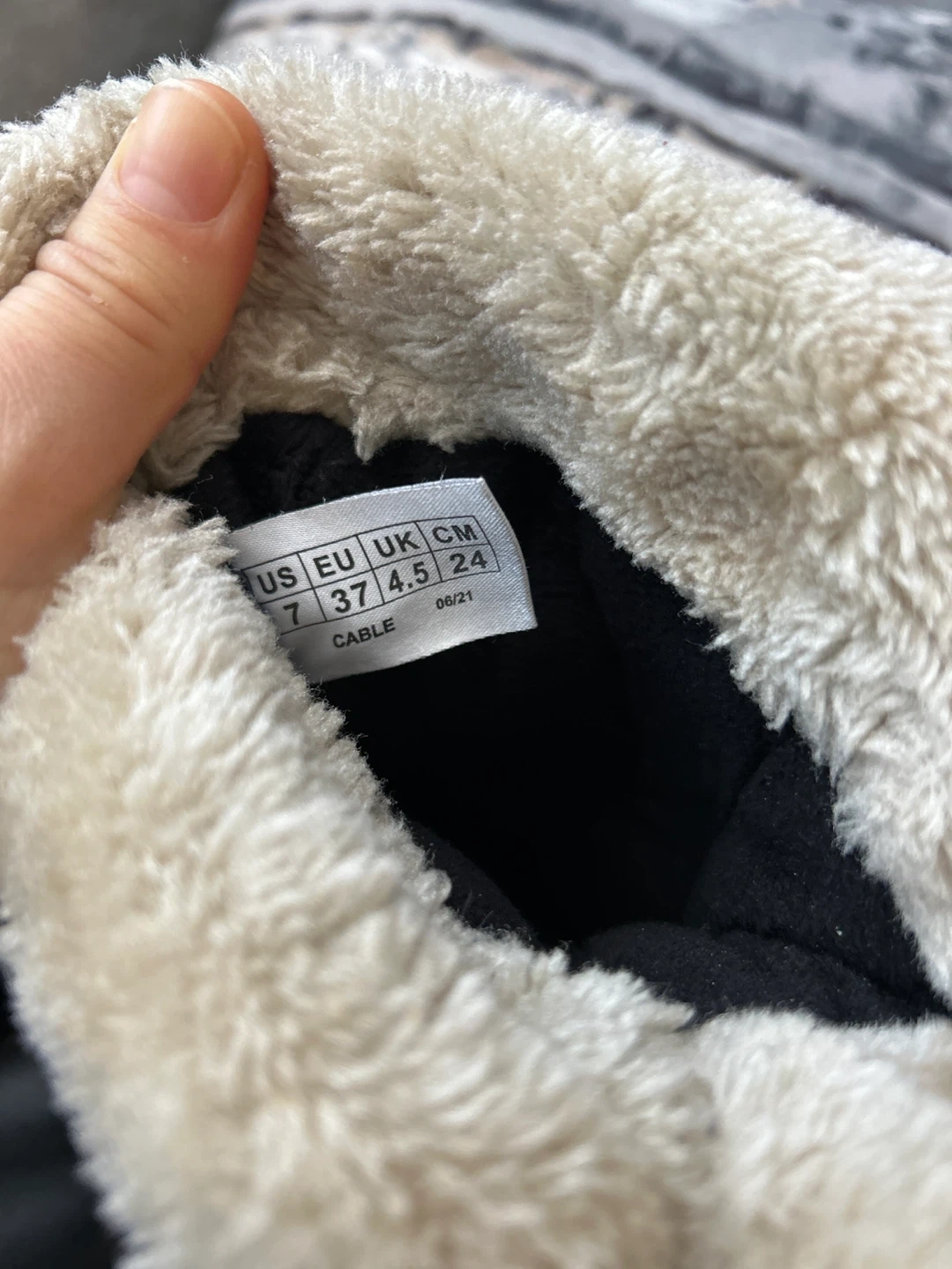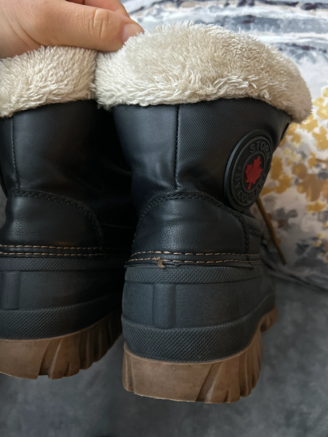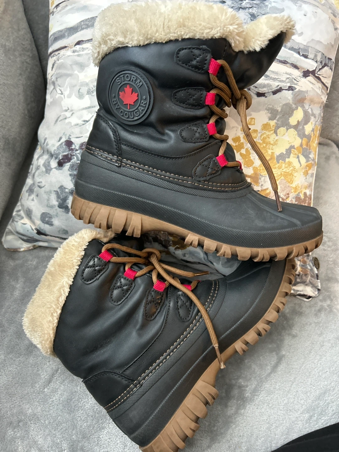 These Cougar Storm boots are black with a cozy faux fur lining. They're size 7 US, 37 EU, 4.5 UK, and 24 CM. I am 38 EU and it fits me. Perfect for keeping your feet warm and dry during the colder months! I have used them twice for mountain climbing. Only serious requests!