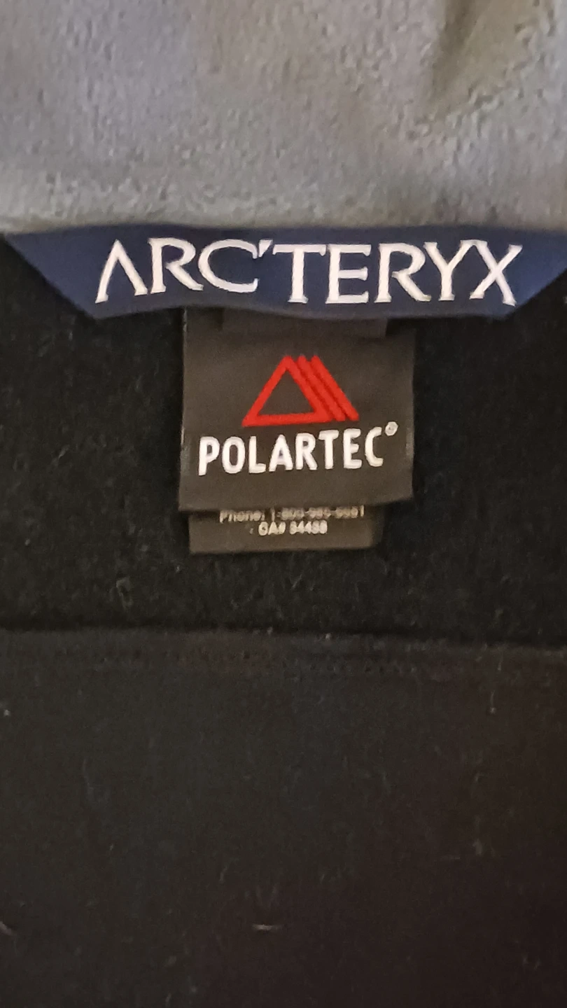 Black Arc'teryx vest made with Polartec material. It's a sleeveless jacket with a full zipper. Great for layering on cooler days, and there for warm days too!