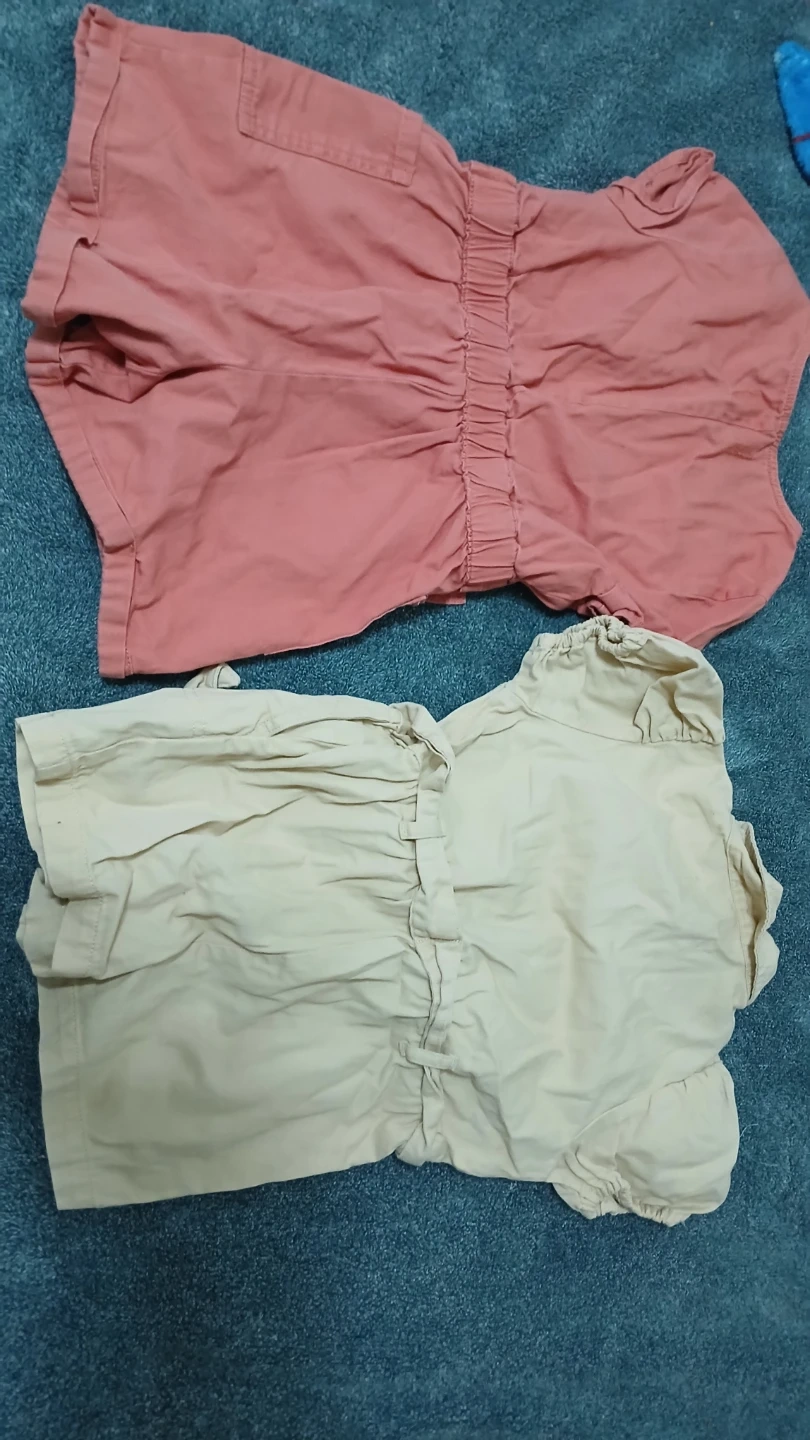 Two cute Old Navy shortalls for kids. One is a coral pink and the other is a light tan color. Both have belted waists and button fronts.