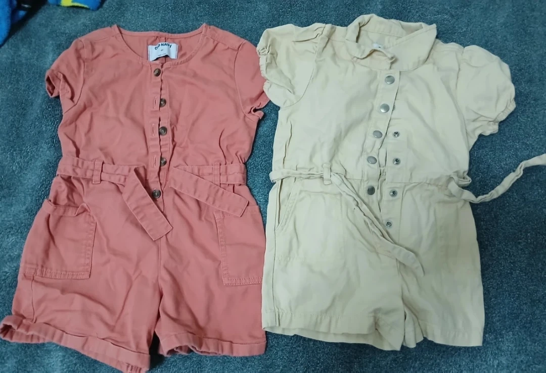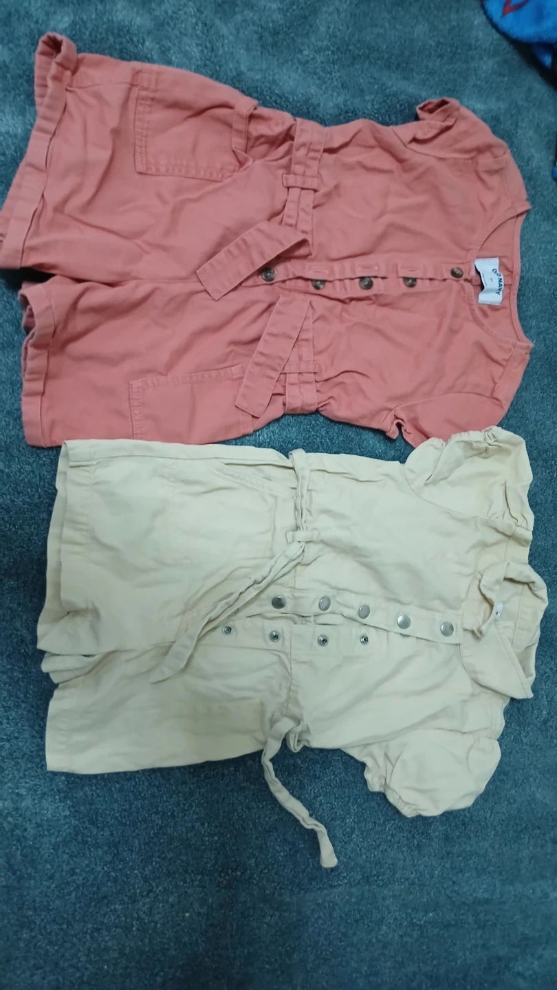 Two cute Old Navy shortalls for kids. One is a coral pink and the other is a light tan color. Both have belted waists and button fronts.