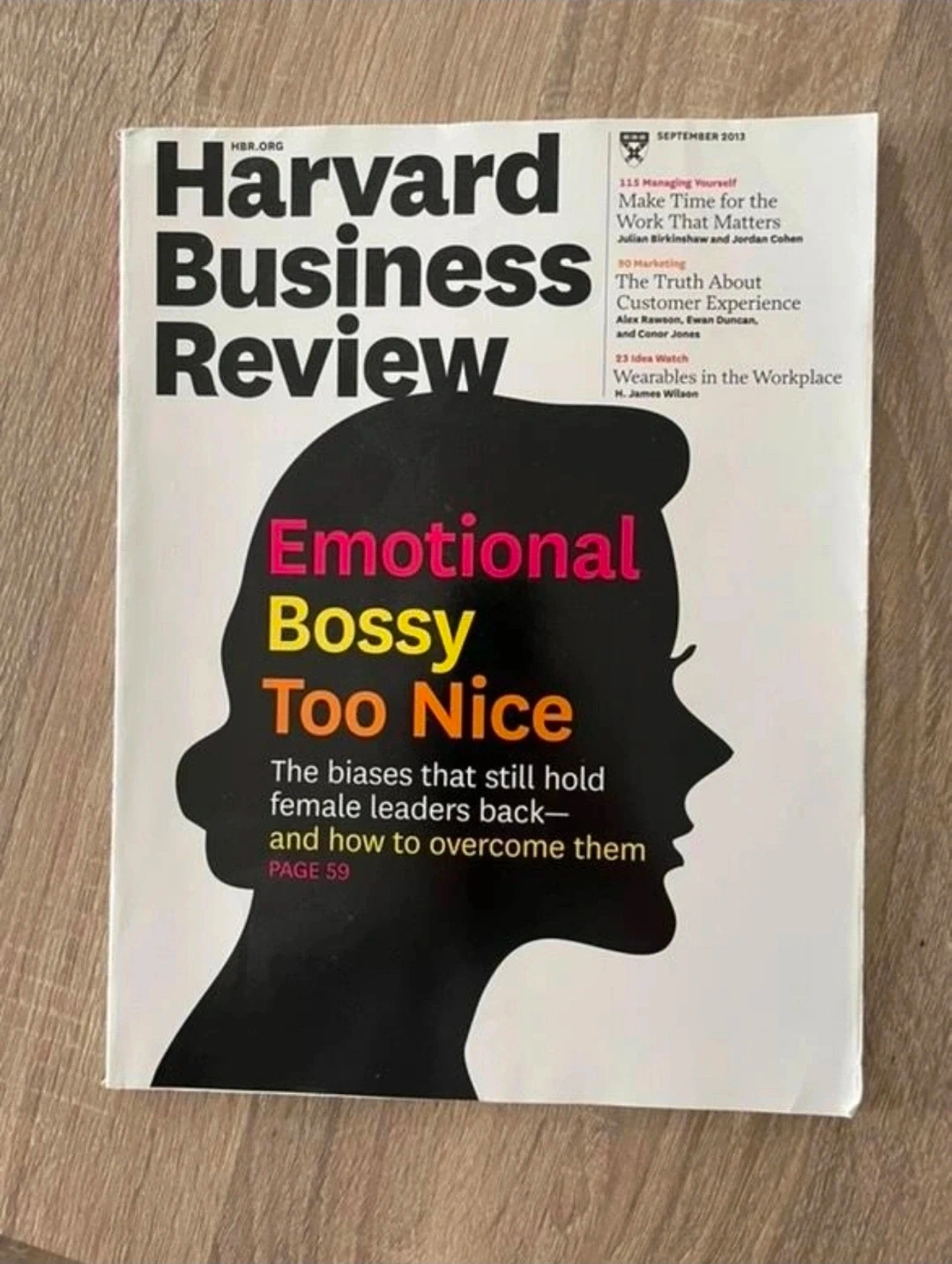 This issue features articles on managing yourself, customer experience, and wearables in the workplace. It also covers biases that hold female leaders back. Published in September 2013.