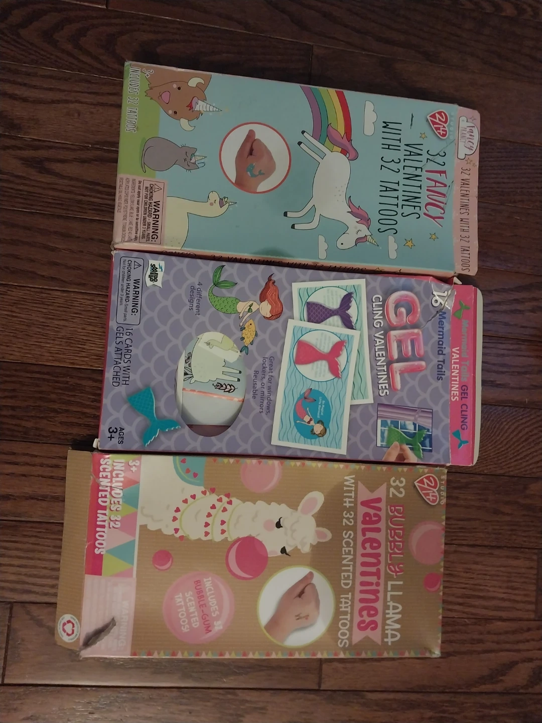 Includes three sets of Valentine's temporary tattoos. One set features 32 fancy designs with unicorns and llamas. Another offers 16 mermaid tail gel clings. The third set has 32 bubble-gum scented llama tattoos. All are recommended for ages 3 and up.