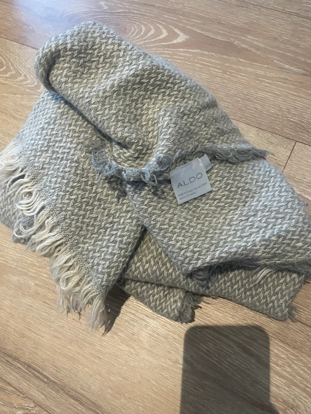 ALDO woven scarf in a grey and white pattern. It has fringed edges. This scarf is perfect for keeping warm on cooler days!