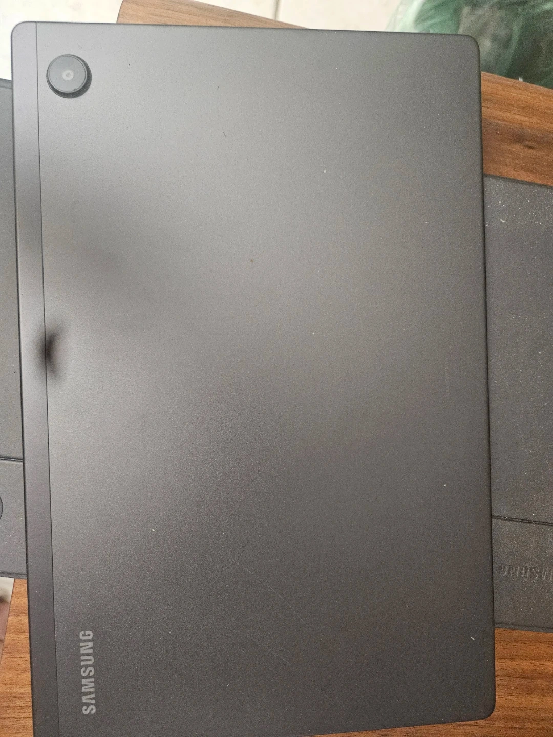 This is a Samsung tablet. It's a dark gray color. The back has a camera lens.