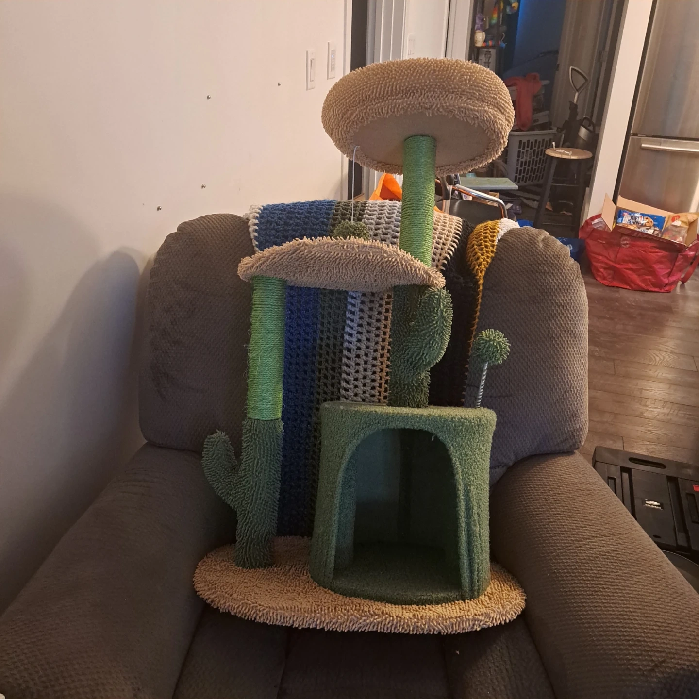 This cat tree features multiple levels for lounging and playing. It has sisal rope scratching posts for claw maintenance and cozy condos for napping. Your feline friend's new favourite spot! Not suitable for big cats