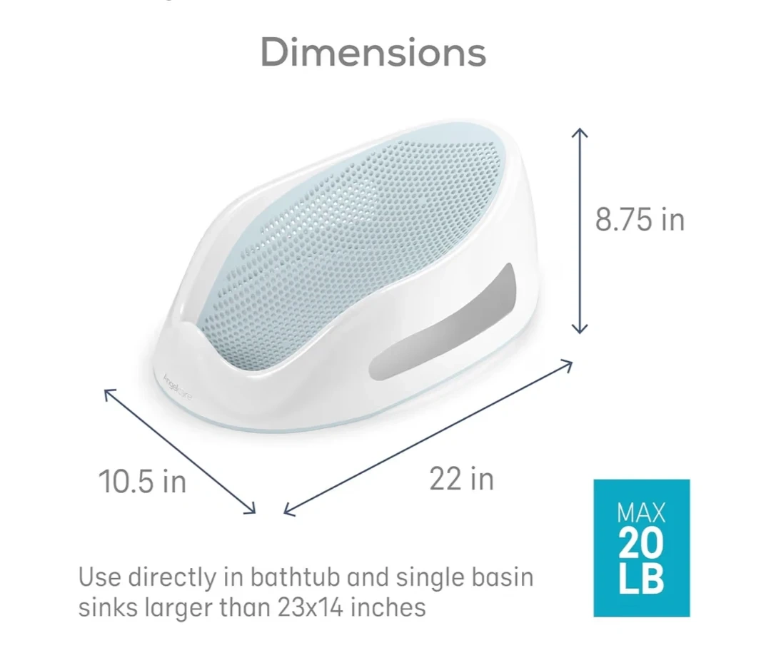This Angelcare bath support is designed for newborns up to 6 months, with a maximum weight of 20 lbs. It features a non-slip surface and ergonomic design for safe bathing. Dimensions are 22 inches long by 10.5 inches wide by 8.75 inches high. Use directly in a bathtub or a single basin sink larger than 23x14 inches.