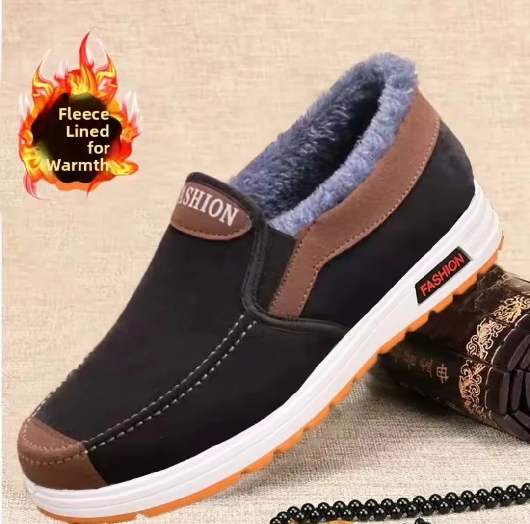 These men's slip-on shoes are fleece lined for extra warmth. They feature a durable canvas upper with brown accents. The orange and white sole provides good grip.