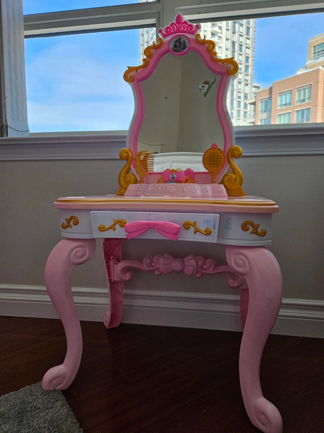 This makeup dressing table is a wonderful addition to any bedroom, or playroom. Can provide a fun play experience for little girls. This is an interactive dresser. It plays music/song and speaks on pressing the gem button.