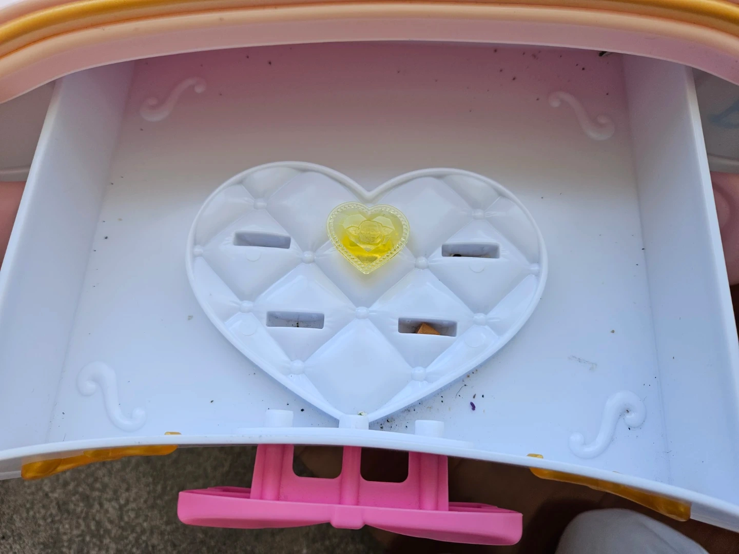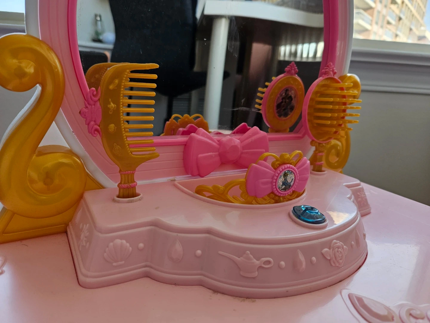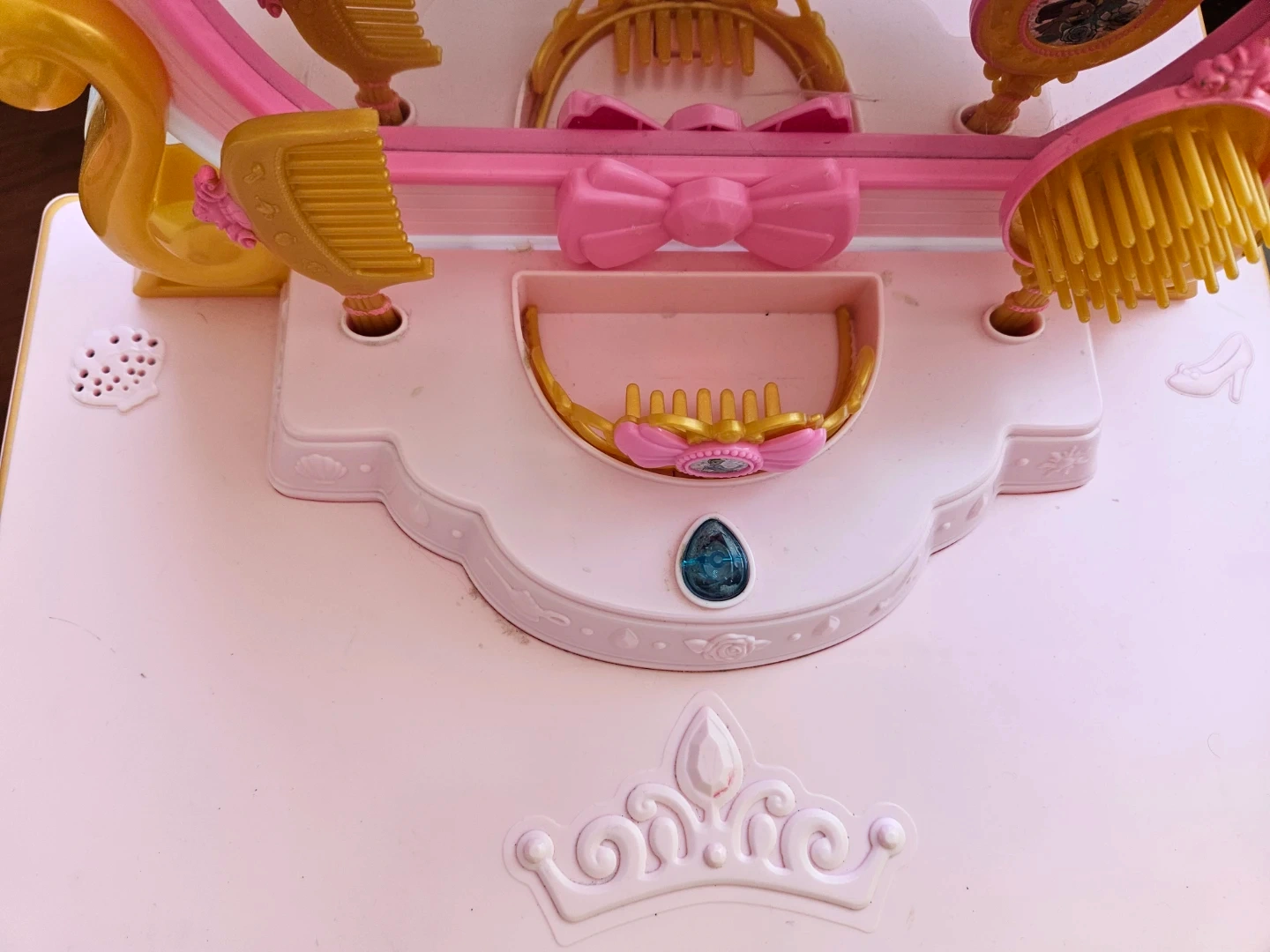 This makeup dressing table is a wonderful addition to any bedroom, or playroom. Can provide a fun play experience for little girls. This is an interactive dresser. It plays music/song and speaks on pressing the gem button.