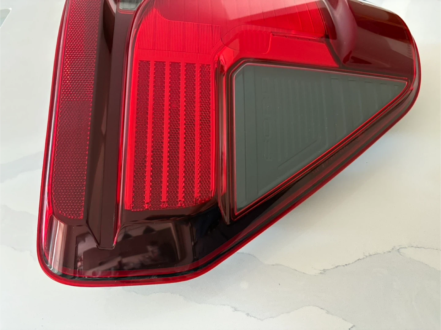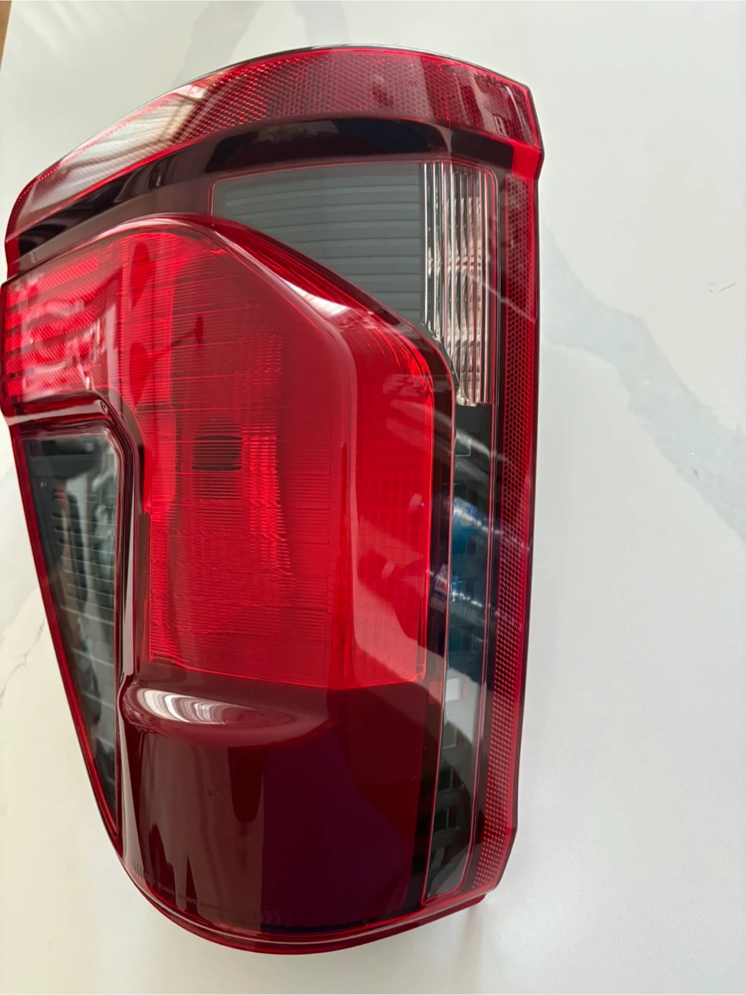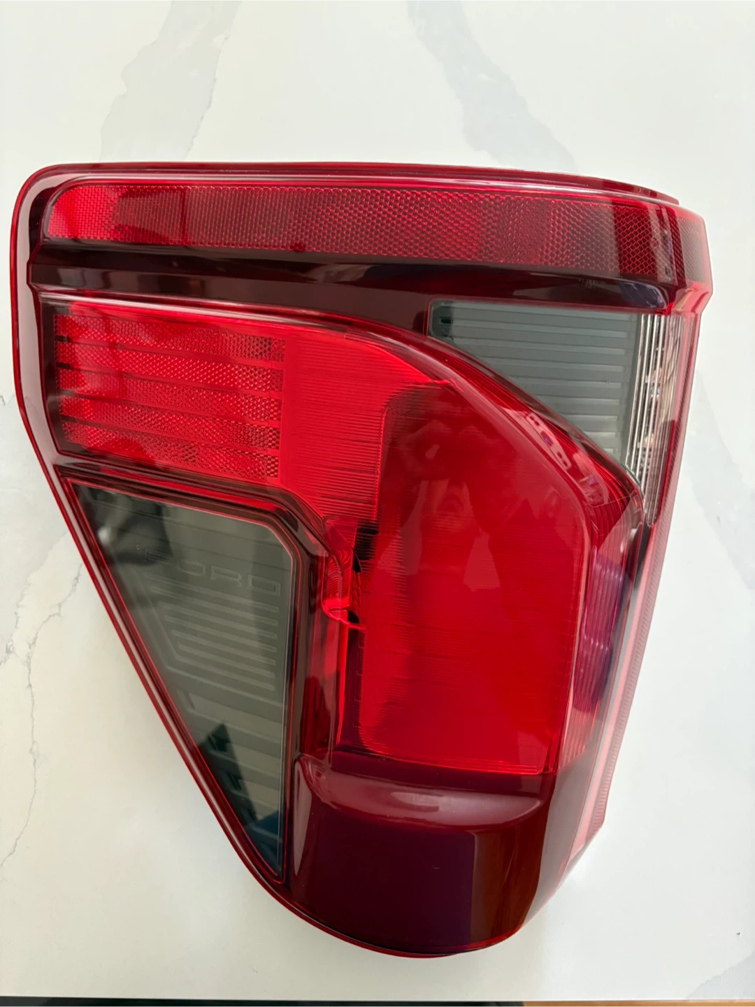 This is a tail light assembly for a Ford F150 truck driver side. It's a red and black unit with a clear reverse light section. It's a direct replacement part for your vehicle.