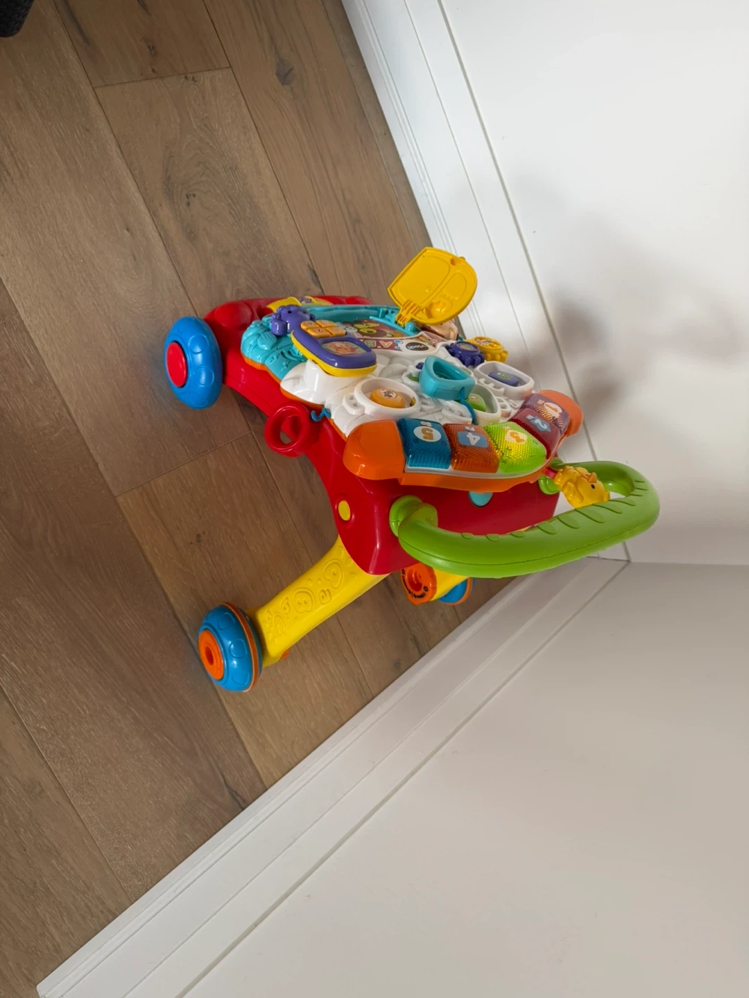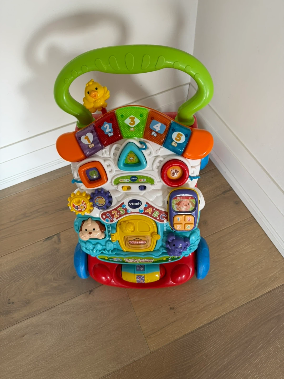 This VTech learning walker is designed to grow with your child, offering engaging activities. It converts from a floor toy to a walker. It has multiple interactive learning stations with colourful buttons and fun sounds.