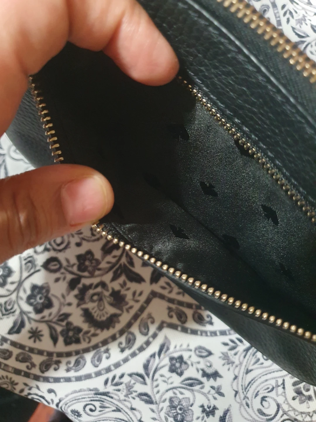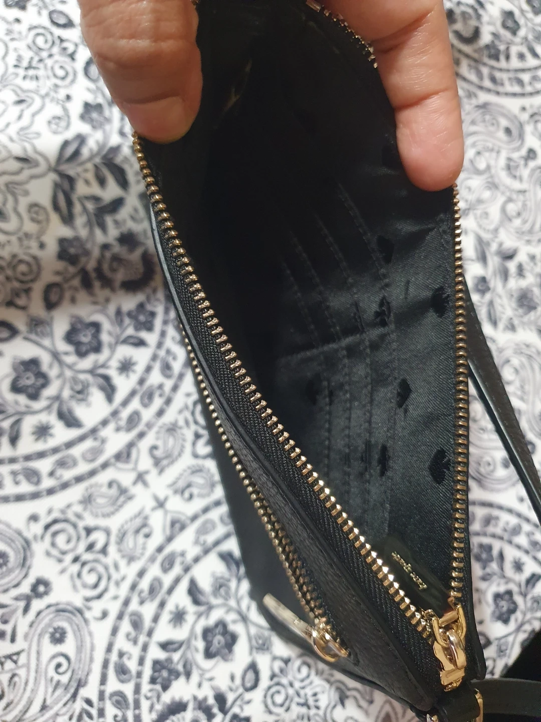This brand new never been used Kate Spade wristlet is made of black pebbled leather. It features a zippered main compartment and a front zippered pocket. Inside, there are card slots for organization. It has stylish leaves design inside .
