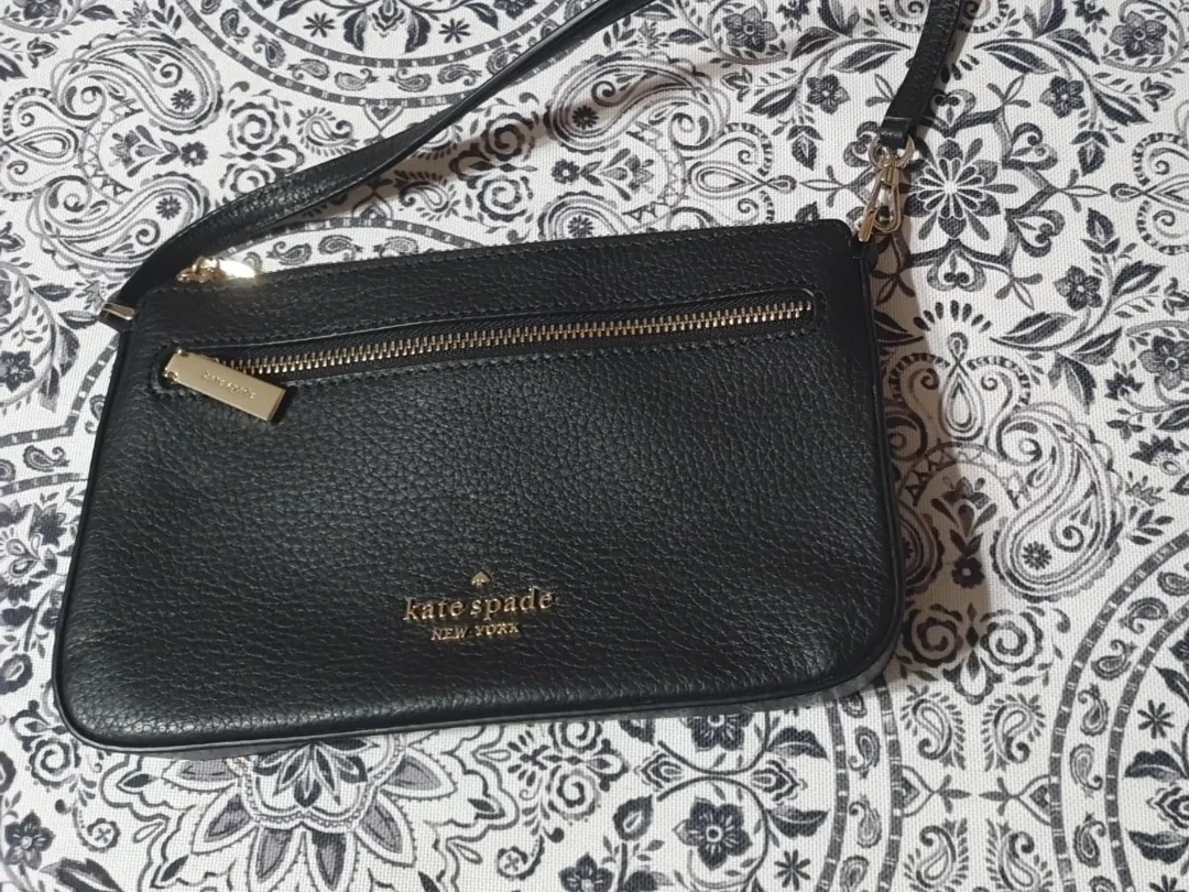 This brand new never been used Kate Spade wristlet is made of black pebbled leather. It features a zippered main compartment and a front zippered pocket. Inside, there are card slots for organization. It has stylish leaves design inside .