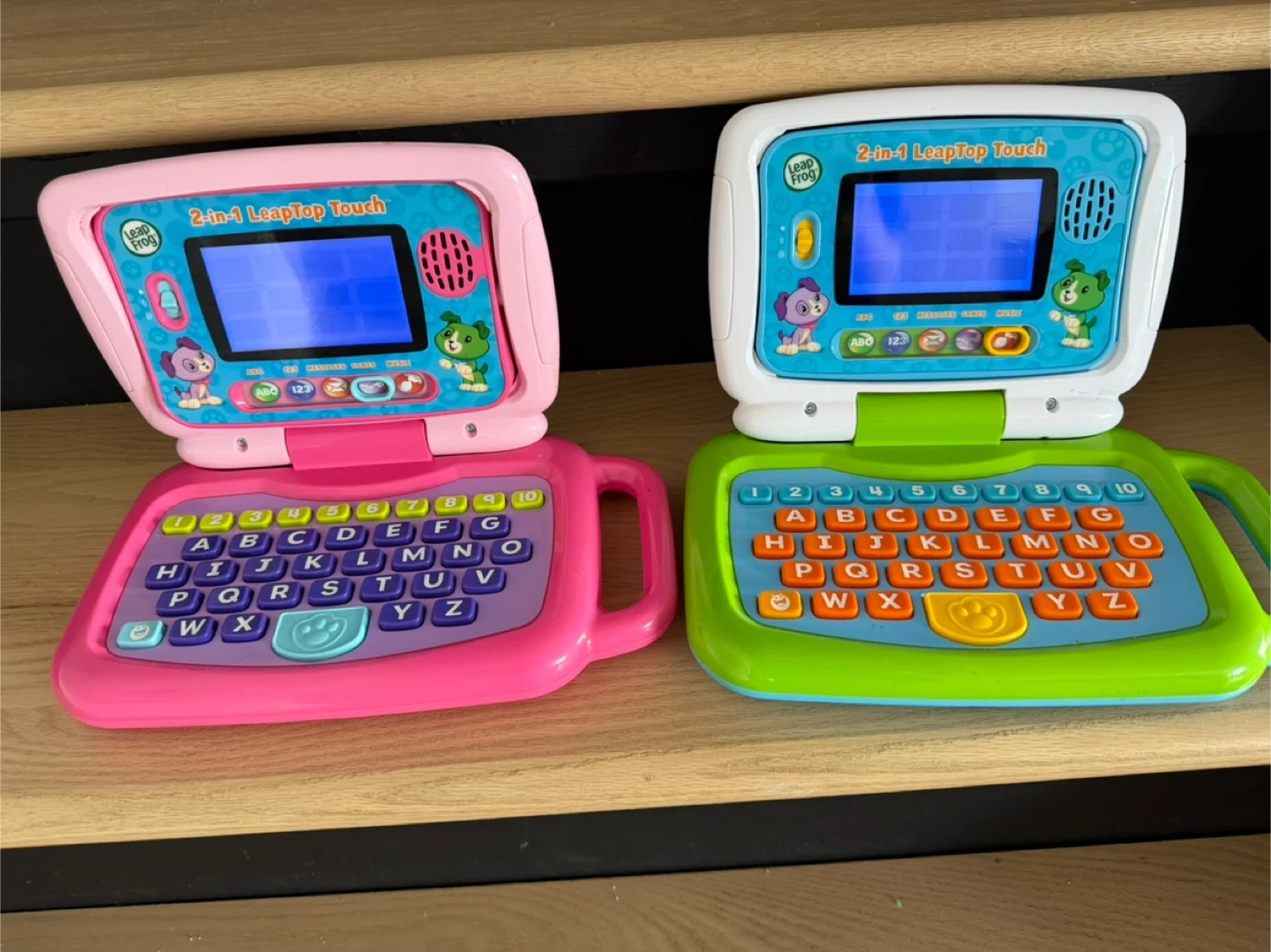 This is a set of two LeapFrog 2-in-1 LeapTop Touch learning toys. One is pink and the other is green. They're designed for young children to learn and play. These encourage early learning skills! $20 each one.