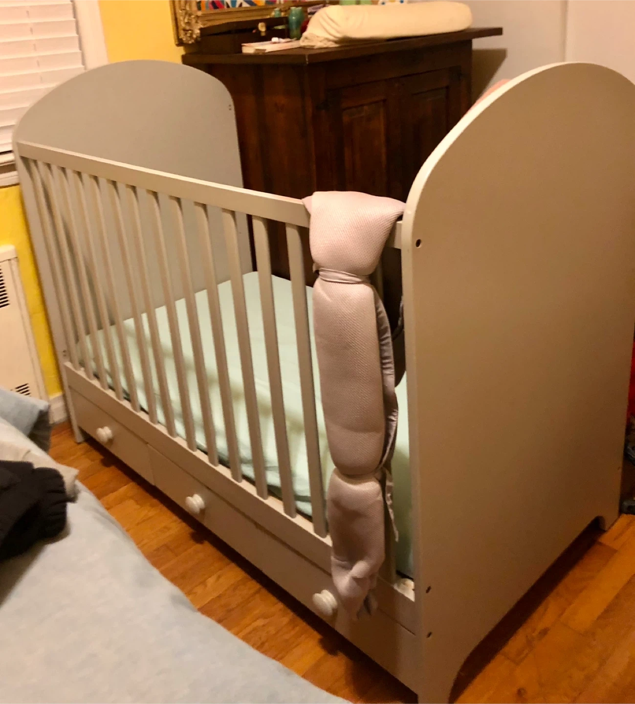 This is a light gray crib with built-in storage drawers underneath. It's a sturdy and functional piece. Includes a mattress pad.