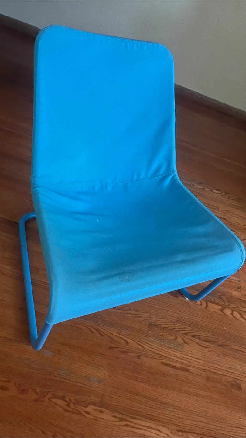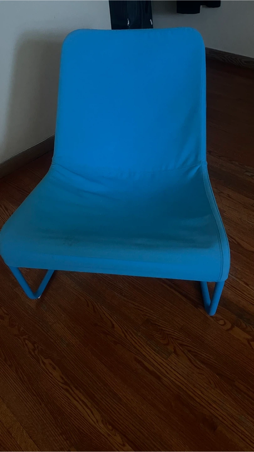 This bright blue accent chair has a simple, modern design. It features a sturdy metal frame with a fabric seat and back. Its lightweight construction makes it easy to move around your space.