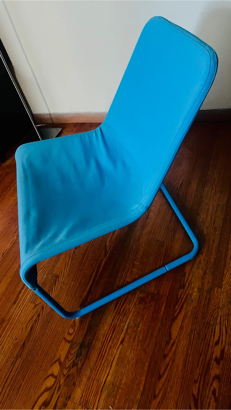 This bright blue accent chair has a simple, modern design. It features a sturdy metal frame with a fabric seat and back. Its lightweight construction makes it easy to move around your space.