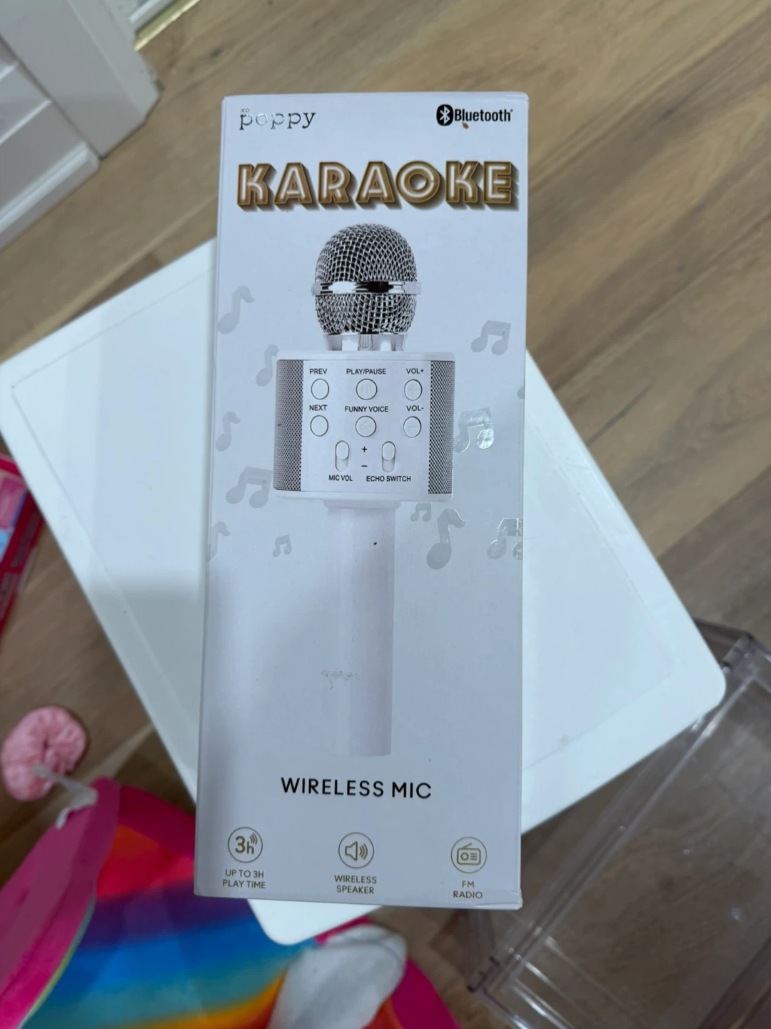 Brand new, This Poppy karaoke wireless mic connects via Bluetooth. It features voice echo effect and full controls. It has up to 3 hours of play time on a single charge. A Micro SD card slot is included for music playback.
