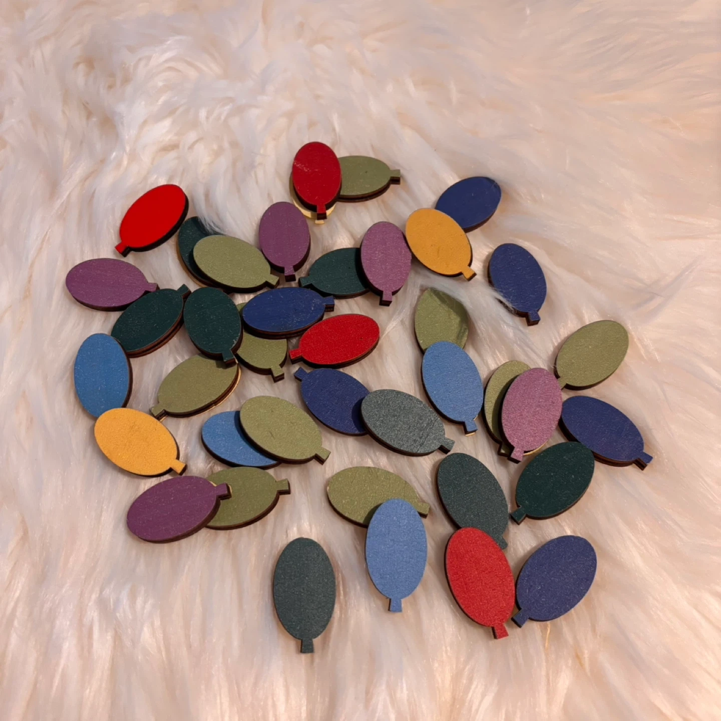 A collection of small, colourful wooden balloon-shaped embellishments. These are great for crafts and DIY projects. They're made of wood and come in various colours, including red, blue, green, purple, and yellow.