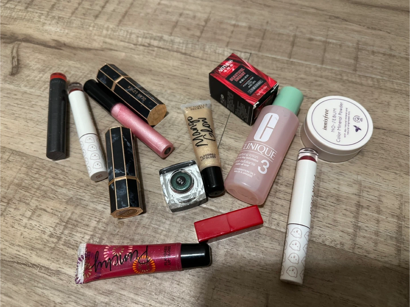 A collection of makeup items including Clinique clarifying lotion, Innisfree No-Sebum powder, Victoria's Secret lip gloss, and various lipsticks and eye shadow. Some items are full-sized and some are minis. Brands include Dear Lover and Artmiss.