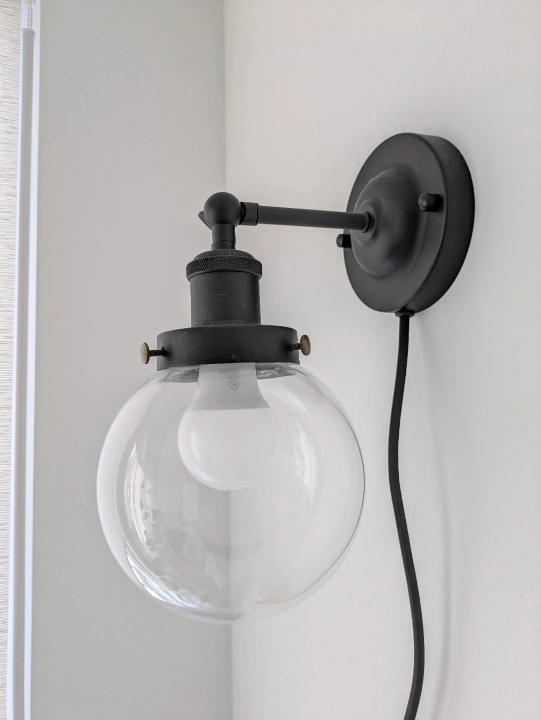 This black wall sconce features a clear glass globe shade and a plug-in cord. It's designed with an adjustable arm for directing light. The fixture uses a standard bulb. It's a simple lighting solution for any room!