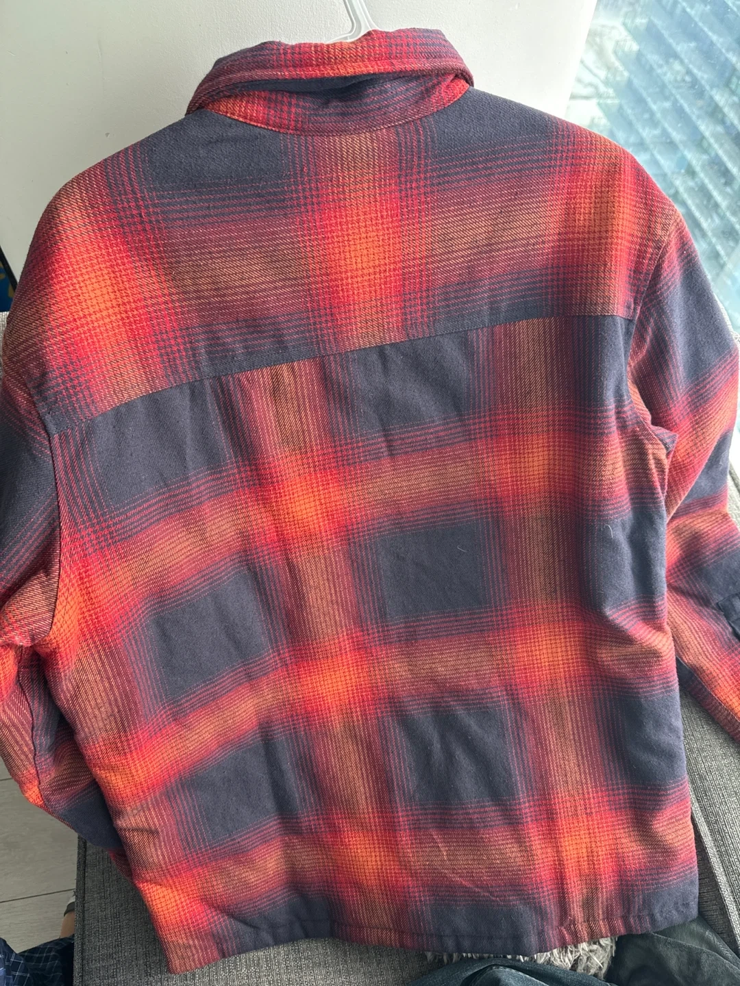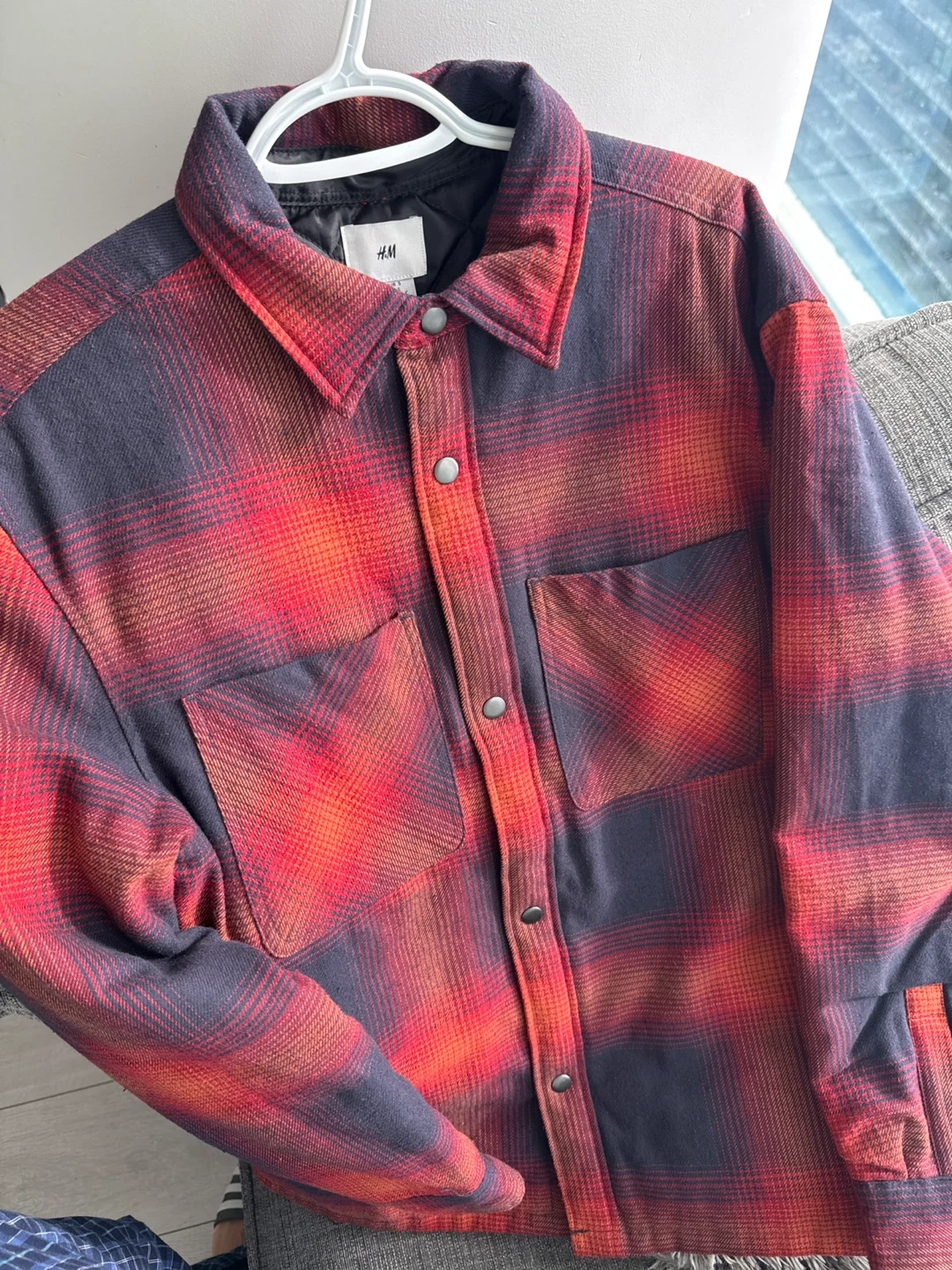 This H&M shirt jacket features a classic plaid pattern in red and navy. It's a button-up style with two chest pockets and a quilted lining for extra warmth. This piece is great for layering during cooler weather!