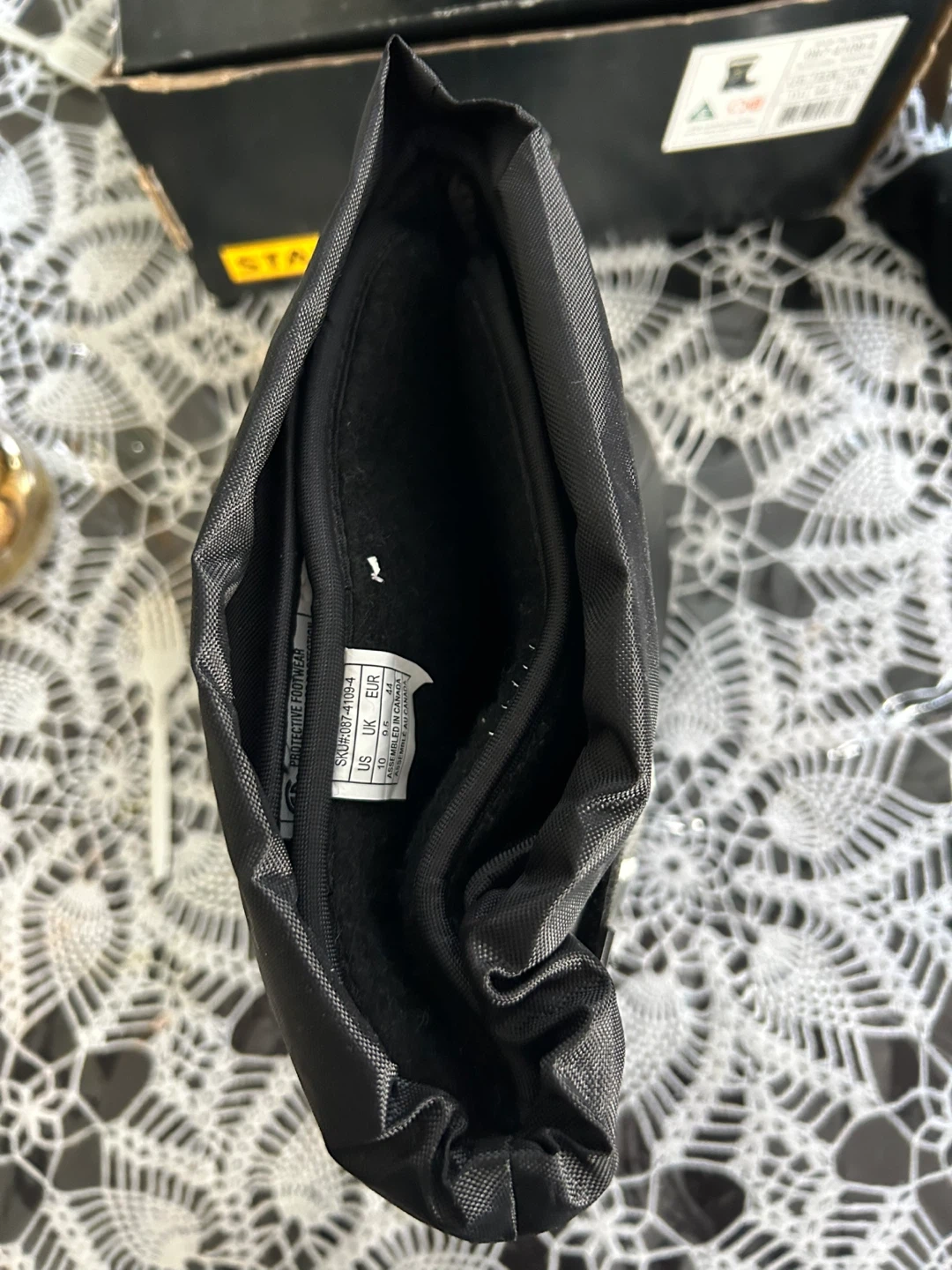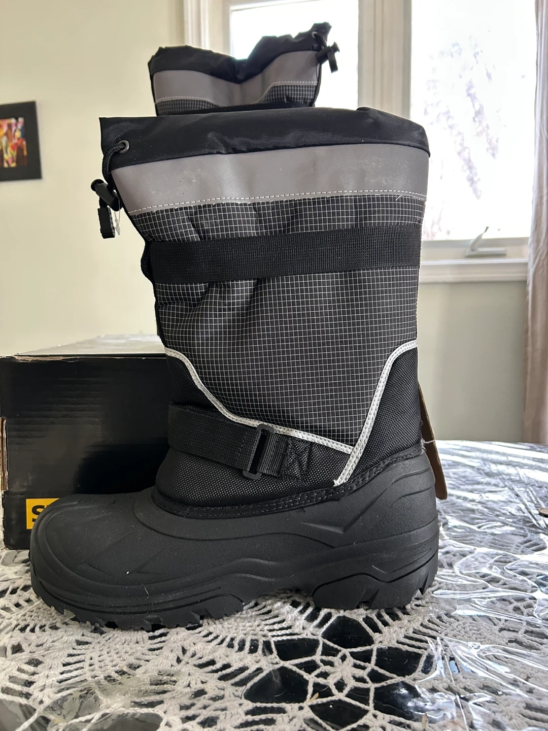 Stanley men's safety winter boots in black and grey. These boots are size 10 US. They're designed for winter conditions. Perfect for this weather to keep your feet warm. Brand new never warm