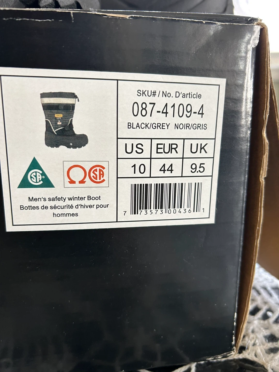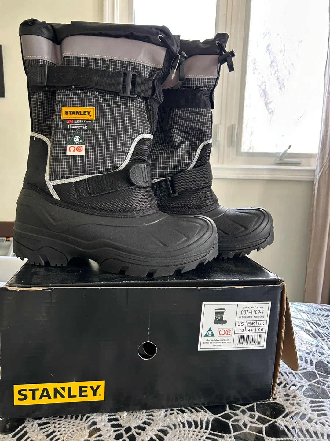 Stanley men's safety winter boots in black and grey. These boots are size 10 US. They're designed for winter conditions. Perfect for this weather to keep your feet warm. Brand new never warm