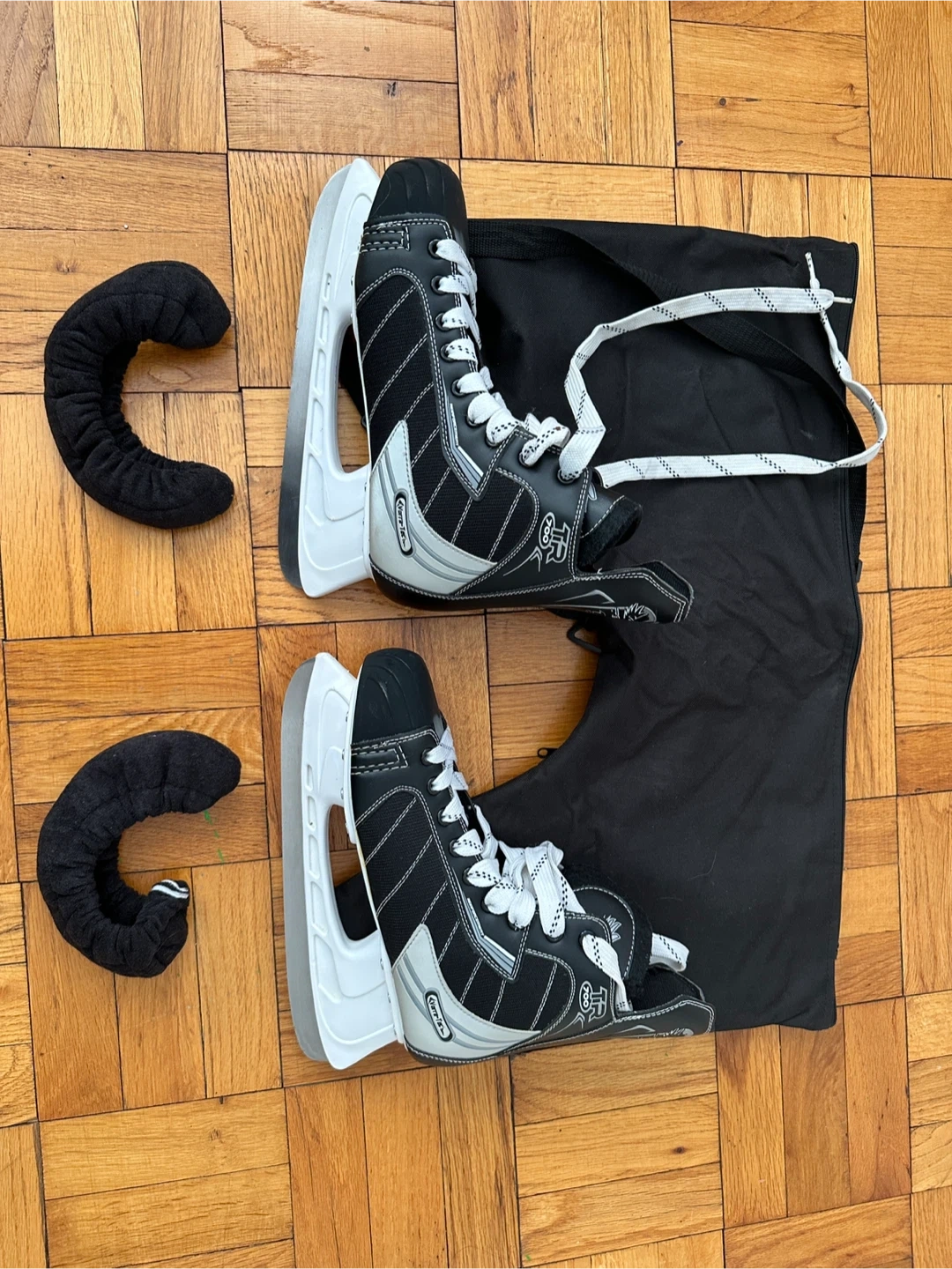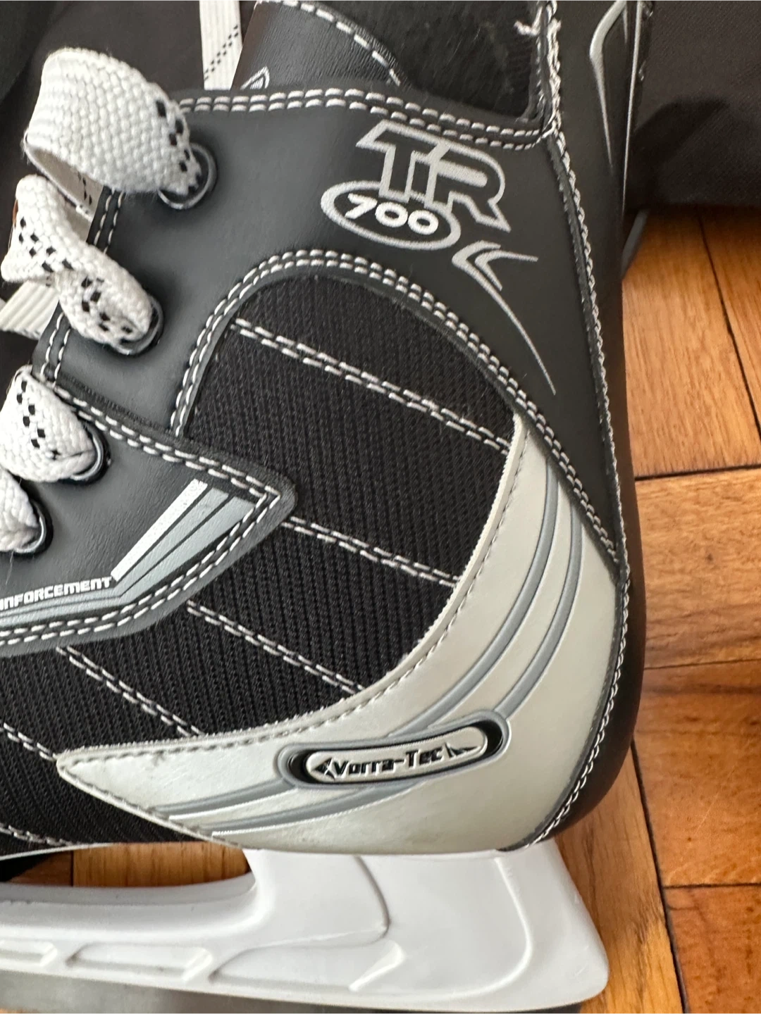 This is a pair of TR 700 ice skates in size 9. They come with black skate guards and a black carrying bag. The skates feature a Vortec-Tech support system.
