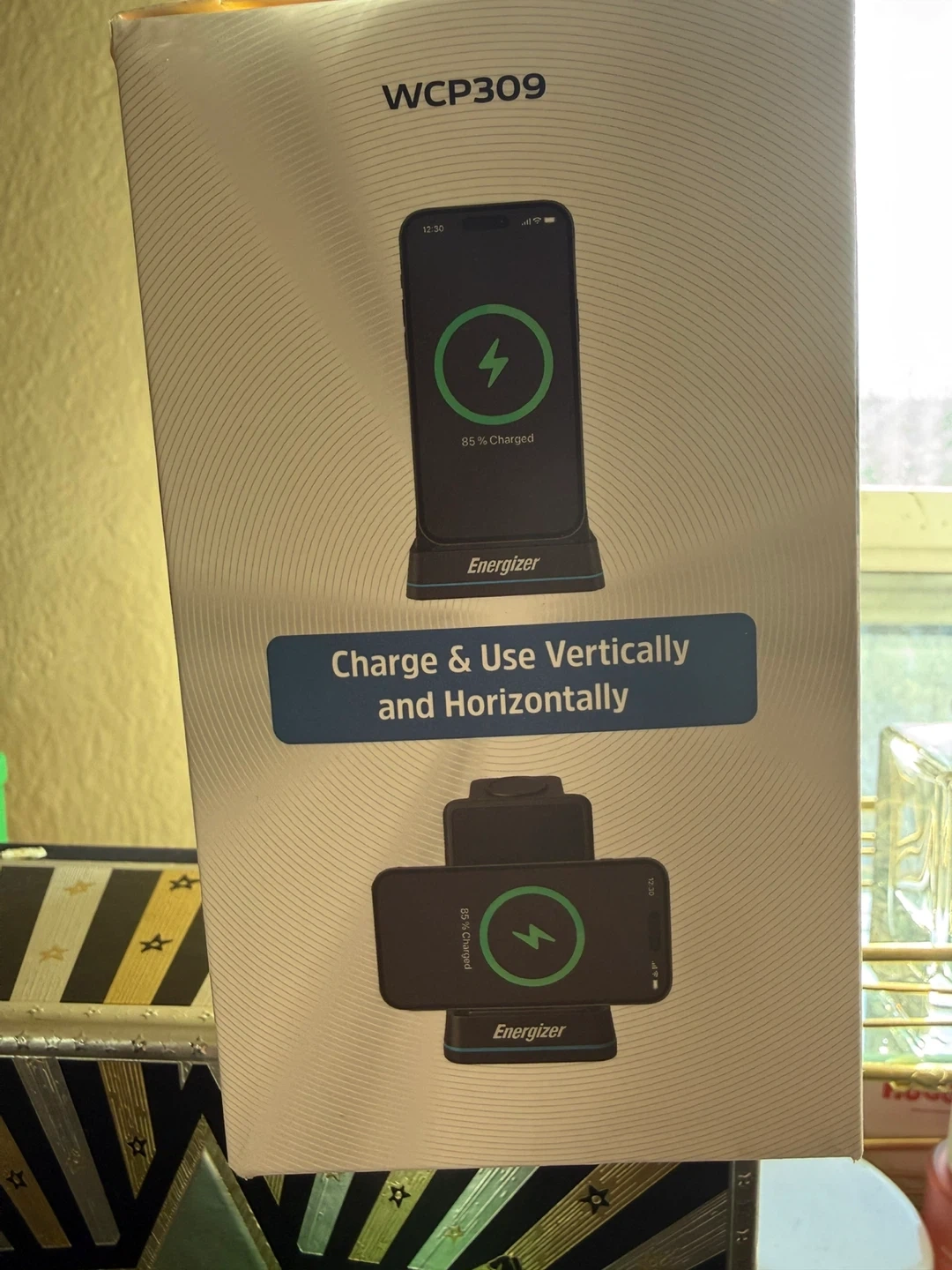 This is an Energizer 3-device wireless charging stand, model WCP309. It's case-friendly and works with cases up to 4mm thick. It charges phones vertically and horizontally. Wall plug not included.
