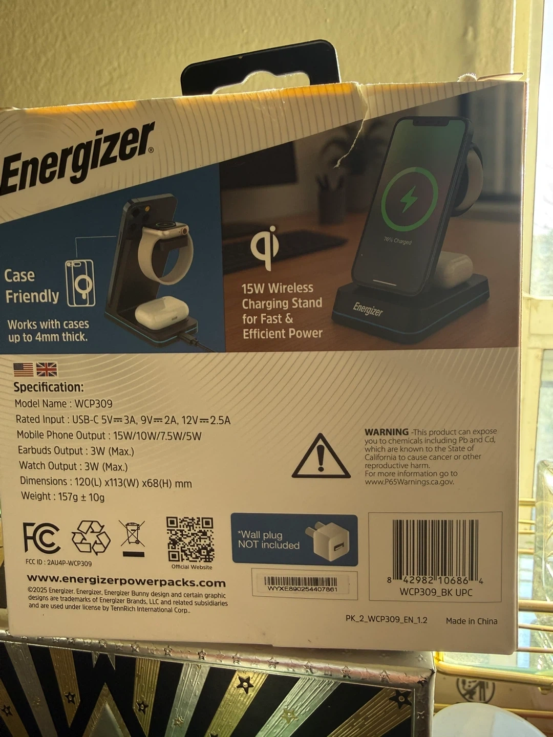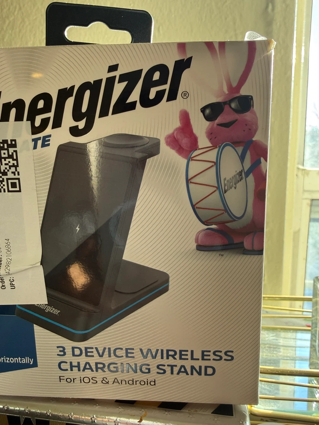 This is an Energizer 3-device wireless charging stand, model WCP309. It's case-friendly and works with cases up to 4mm thick. It charges phones vertically and horizontally. Wall plug not included.