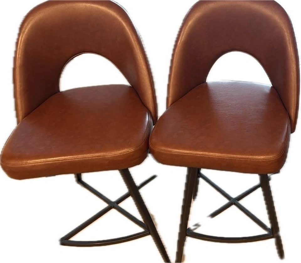 Original price was $149.95. This is a set of 3 Elijah counter-height stools with swivel seats, upholstered in vegan leather fabric with a metal base in brown. They are in great condition.