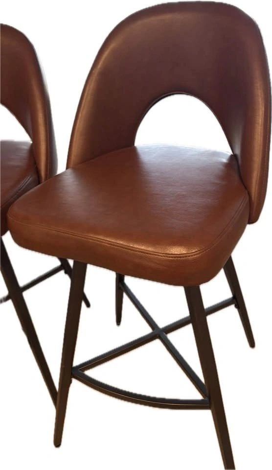 Original price was $149.95. This is a set of 3 Elijah counter-height stools with swivel seats, upholstered in vegan leather fabric with a metal base in brown. They are in great condition.