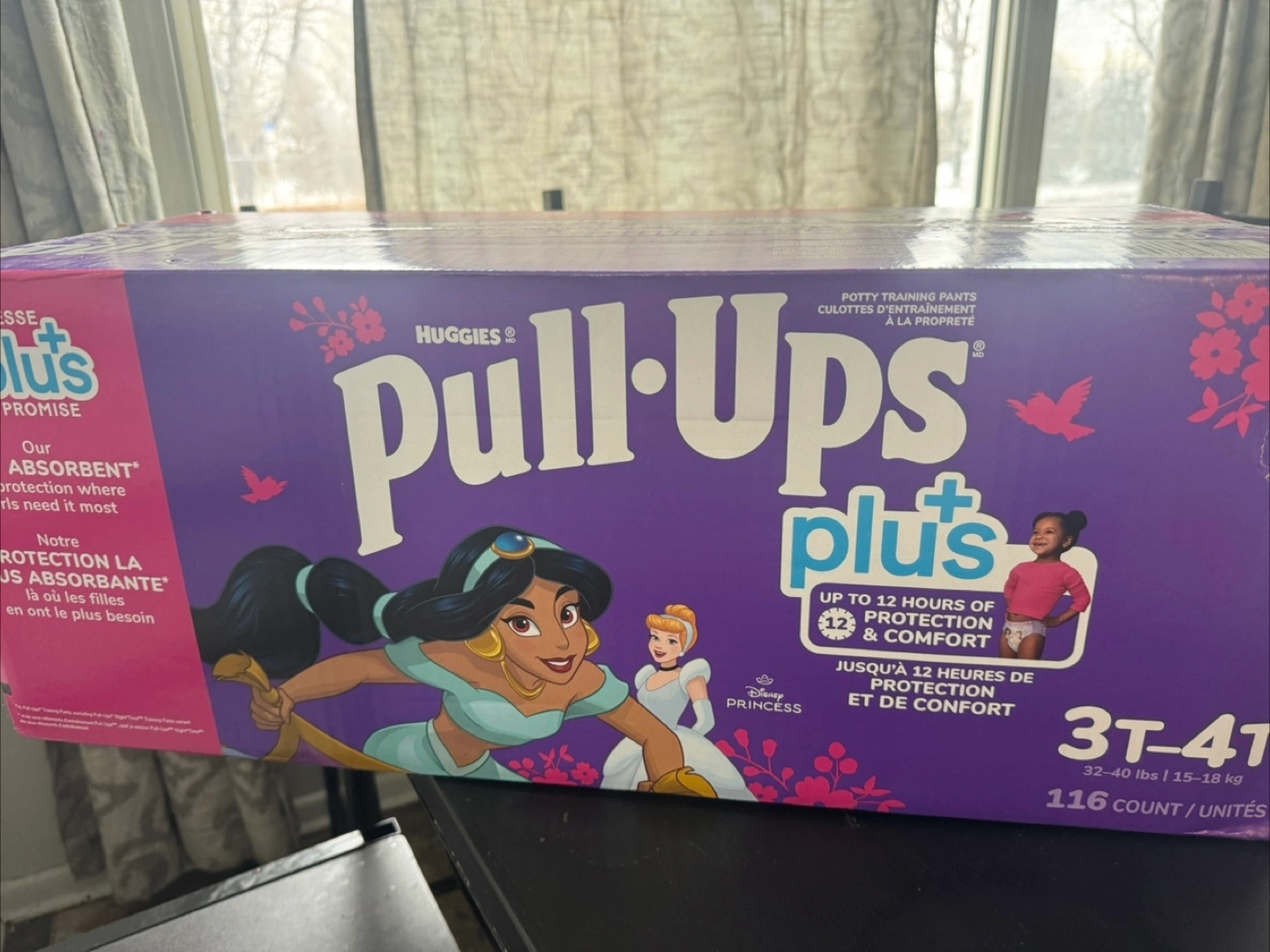 These Huggies Pull-Ups Plus are designed for potty training. They offer up to 12 hours of protection and comfort. This box contains 116 units and is sized for 3T-4T toddlers, fitting 32-40 lbs or 15-18 kg.