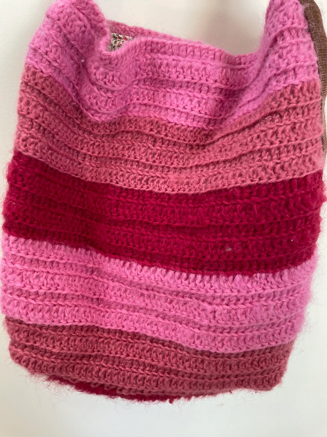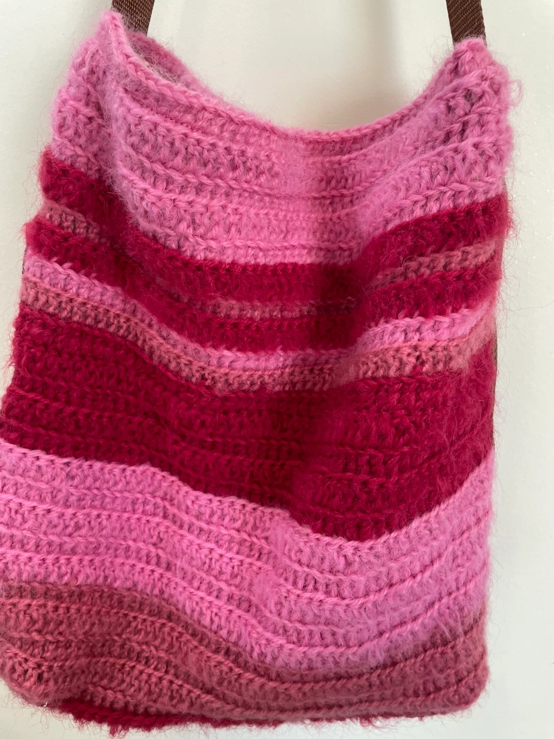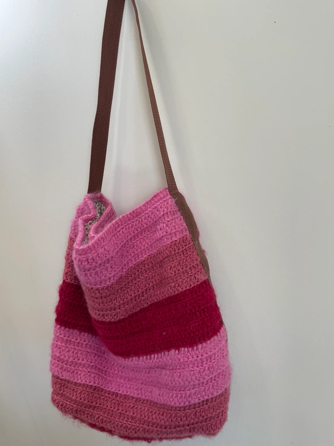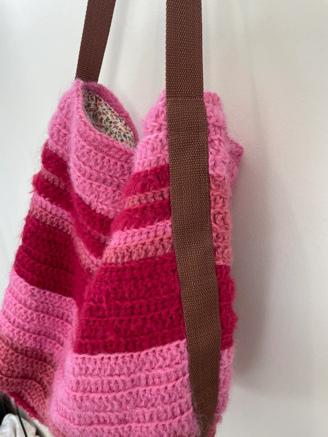 Handmade shoulder bag with colourful pink stripes. It's lined with a floral fabric and has a secure snap closure inside. A stylish everyday bag for essentials!