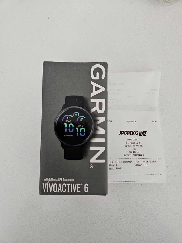 Brand new, sealed in package. Never used. Purchase receipt available. This Garmin vivoactive® 6 is a GPS-equipped smartwatch focused on fitness and wellness. It features a vibrant AMOLED color display and impressive battery life of up to 11 days (varies by use). With over 80 built-in sports apps and daily suggested workouts, you can keep your fitness routine fresh. When paired with your smartphone, you can easily respond to texts, receive emails, and get other notifications right on your wrist. Additional features include music storage, Garmin Pay™ contactless payments, move alerts, and a pulse ox sensor. The Body Battery™ energy monitoring system provides personalized insights based on your sleep, stress, workouts, and more, helping you maintain optimal energy levels. Embrace a healthier lifestyle with the Garmin vivoactive® 6 Smartwatch. Cash accepted, cashless payment also accepted. For sale by owner. Curbside pickup available.