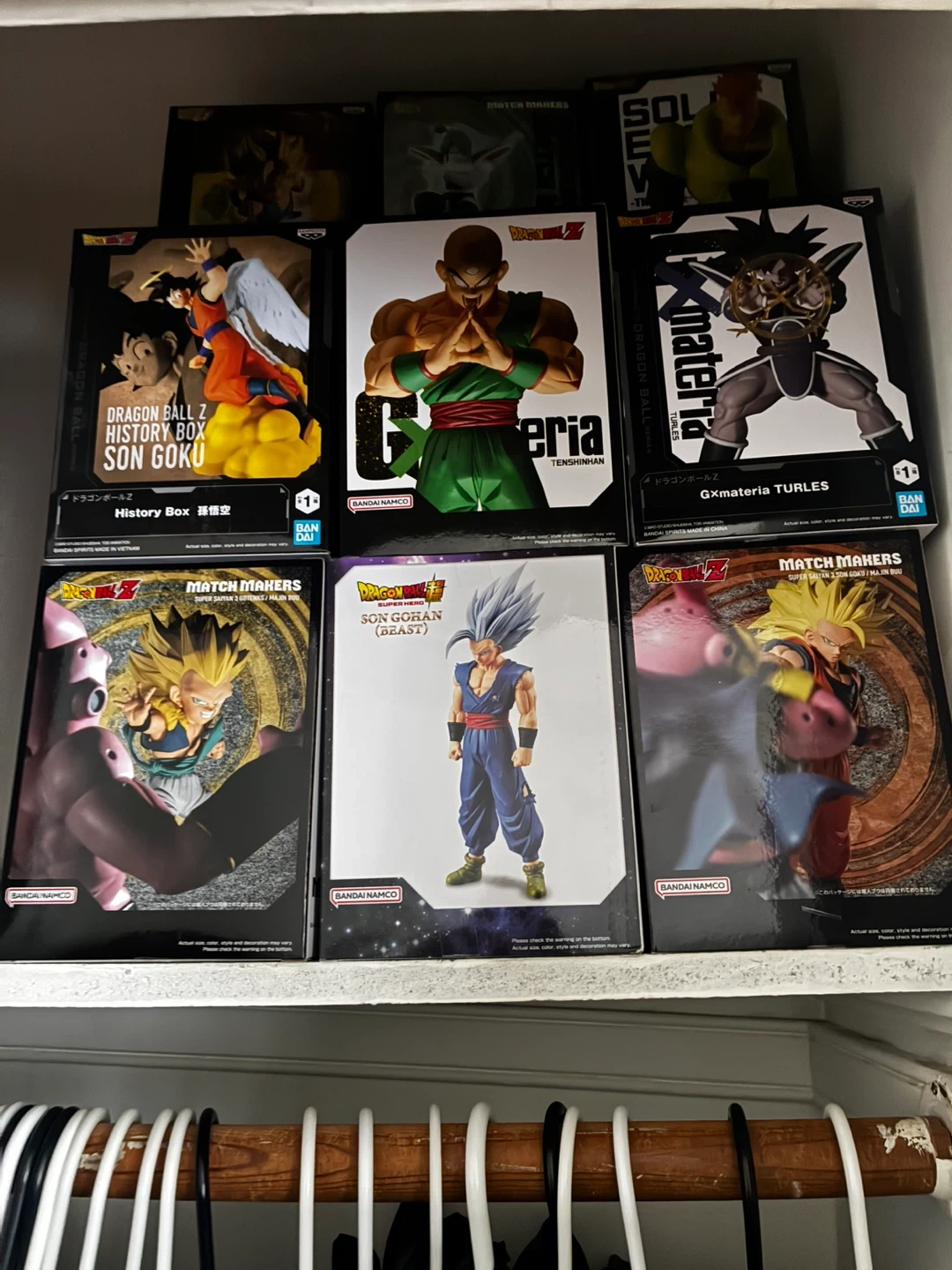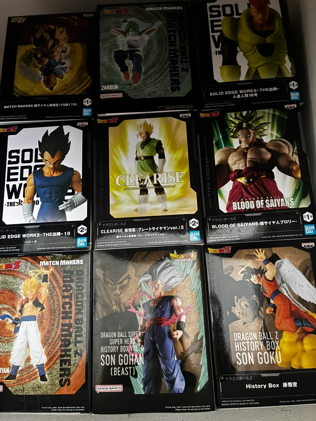 Collection of Dragon Ball Z figures from Banpresto, including Solid Edge Works, Match Makers, Limit Breaker Series, and History Box lines. Features popular characters like Broly, Goku, Vegeta, Piccolo, and more. All items appear to be new in original packaging.