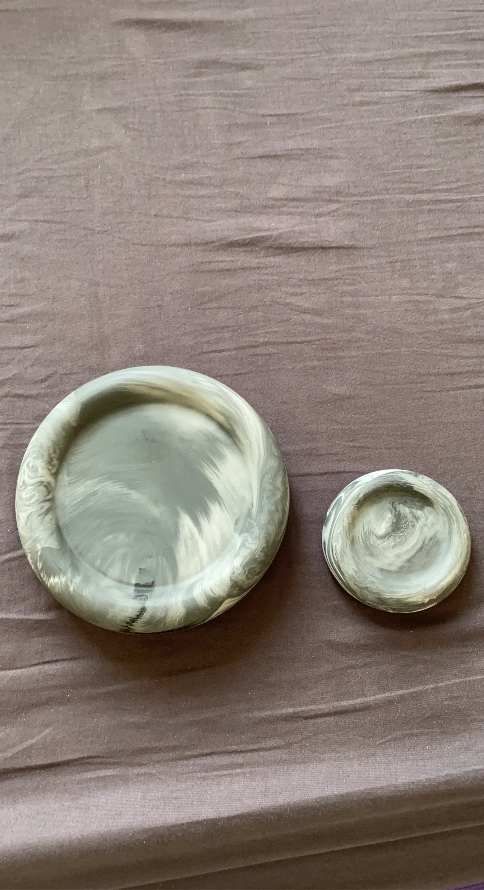 This is a set of two decorative trays with a grey and white marble finish. They're great for holding small items. The larger tray measures approximately 6.5 inches in diameter, and the smaller one is about 3.5 inches in diameter.