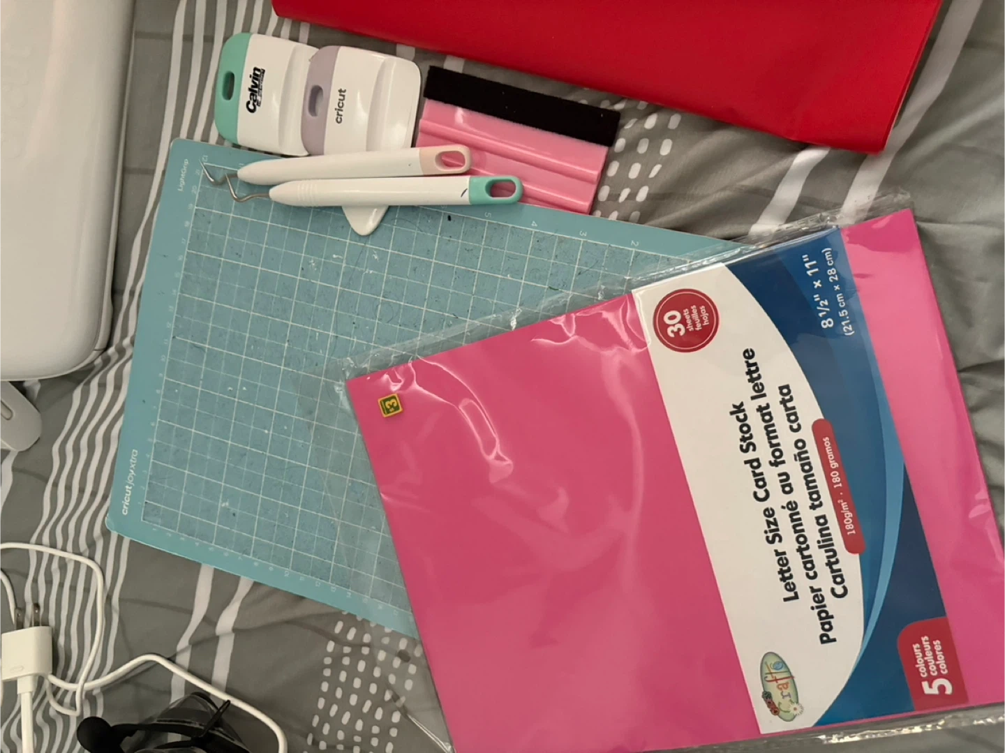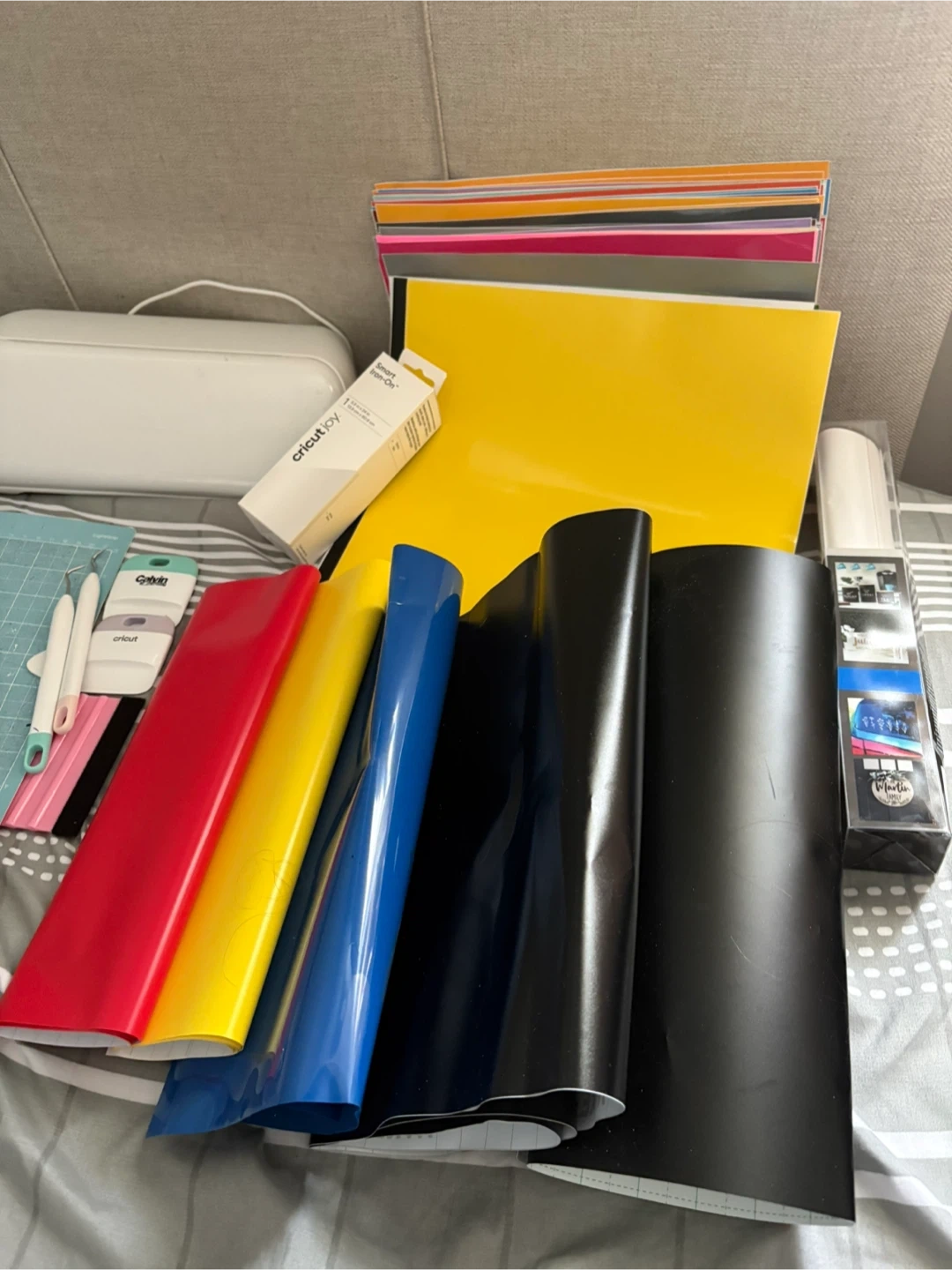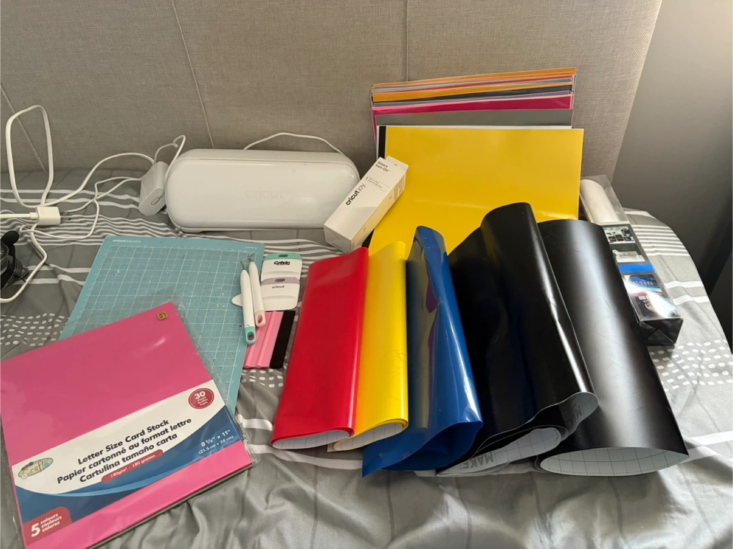 Bundle includes a white Cricut cutting machine, a cutting mat, weeding tools, and various sheets of coloured vinyl and card stock. It's great for crafting projects!