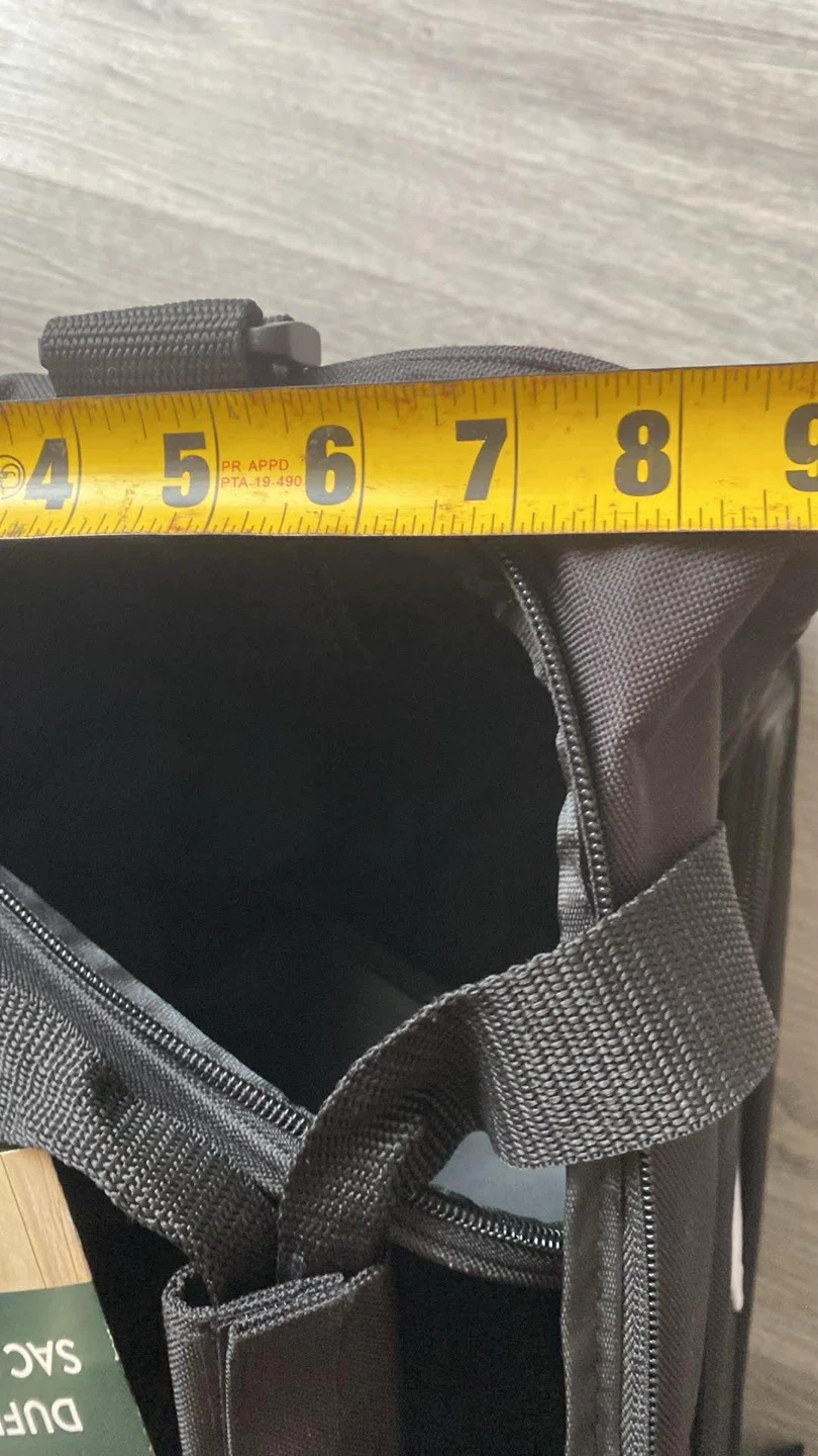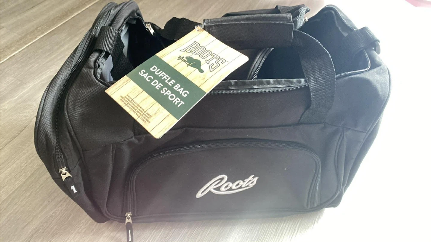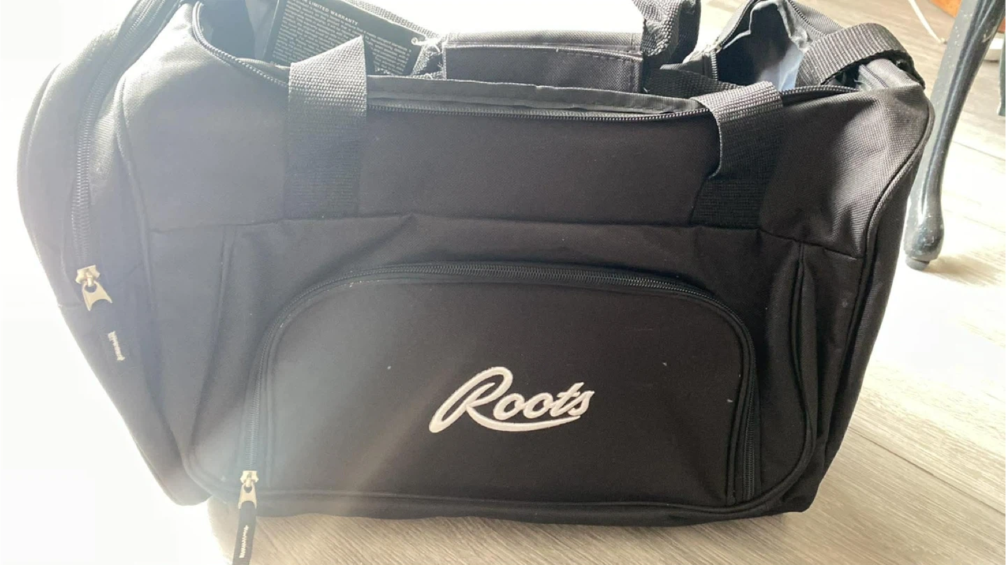 This is a black Roots duffle bag with a 32L capacity. It features a spacious interior and a U-shaped zippered opening for easy access. It also has a practical side pocket for small items and comfortable handles with Velcro wrap.